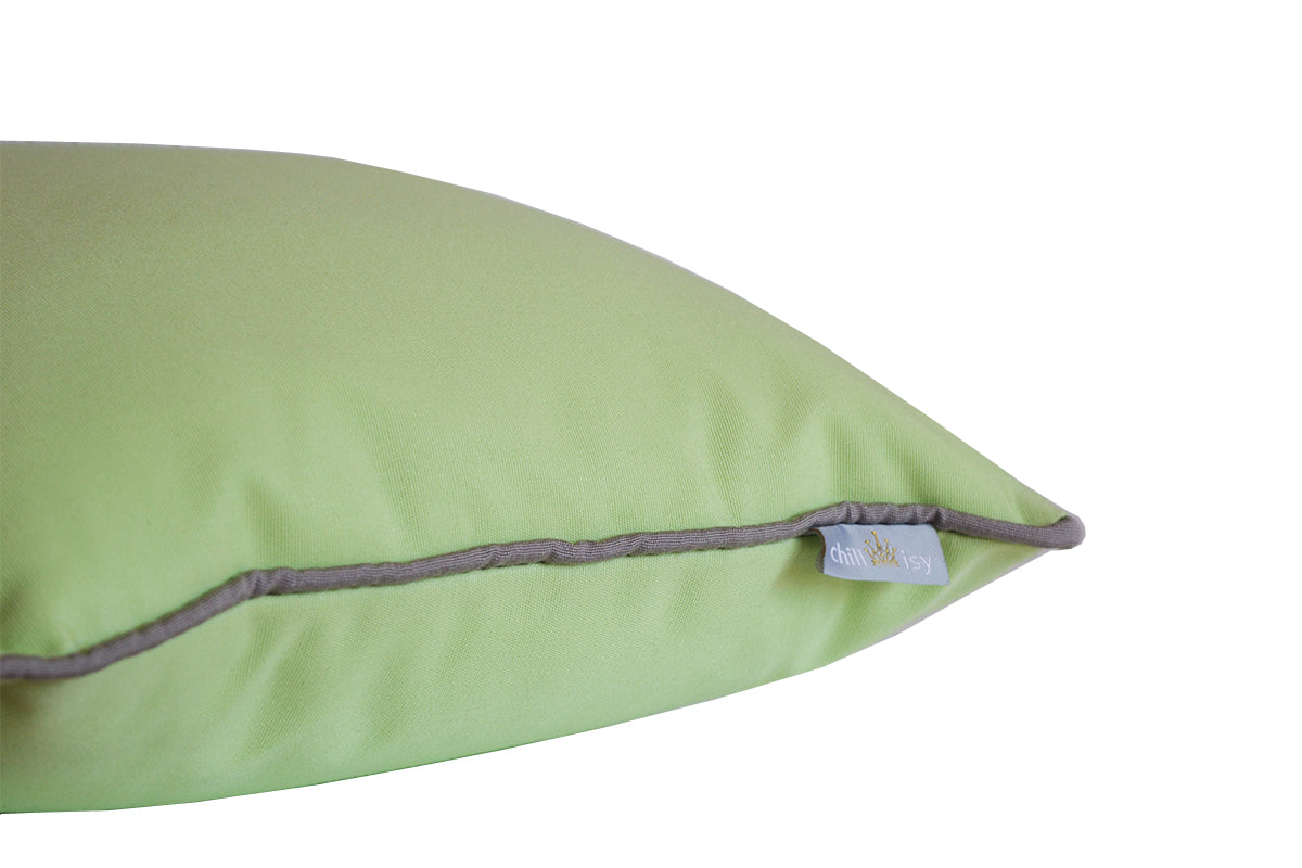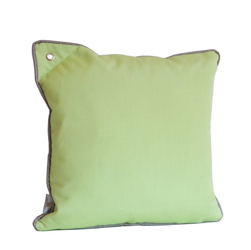 Kissen für Yacht und Boot in der wunderschönen Farbe Lindenbaum Grün. Umrahmt an allen vier Seiten ist das Kissen von einem grauem Keder. Die Haptik des Stoffes ist kuschelig weich, angenehm auf der Haut.