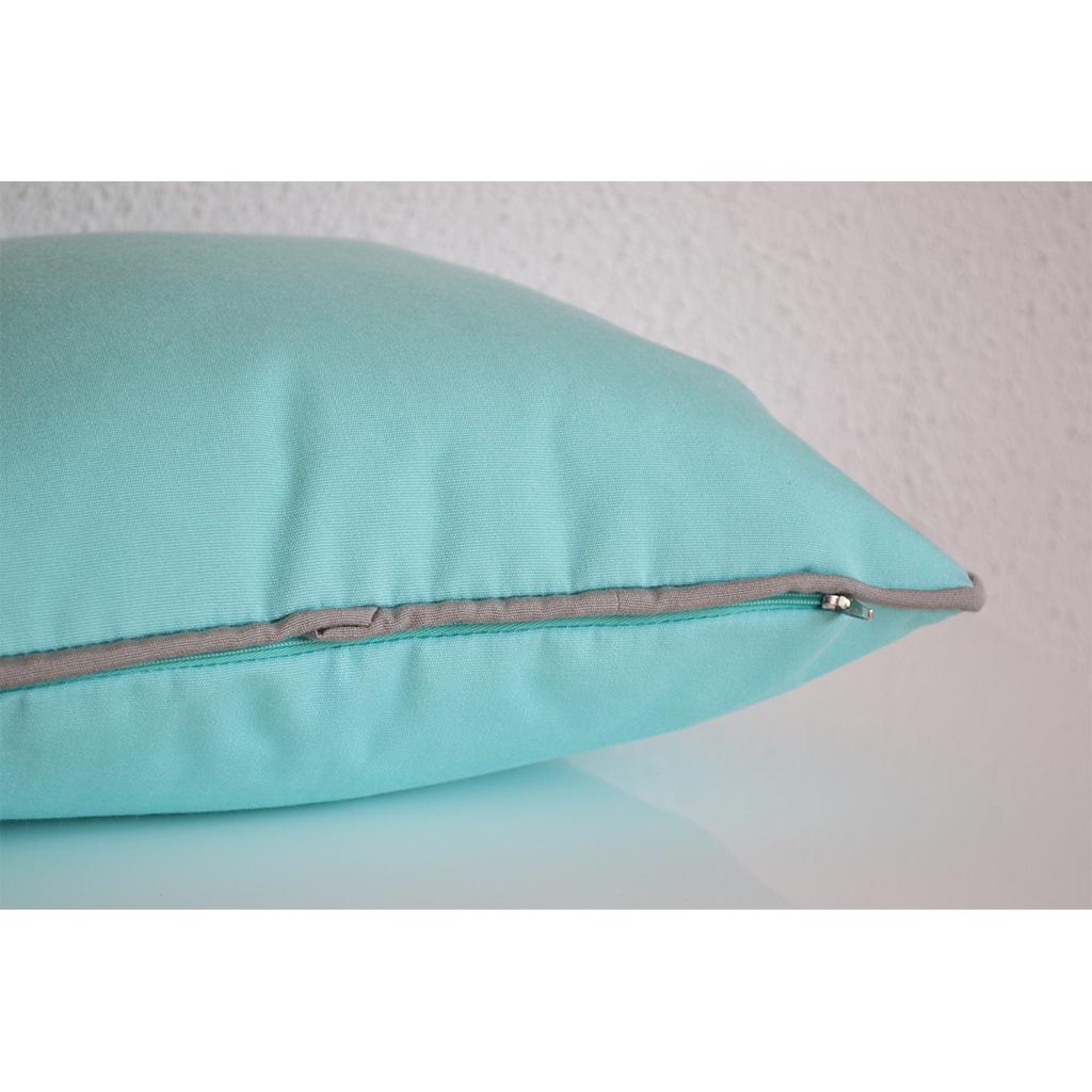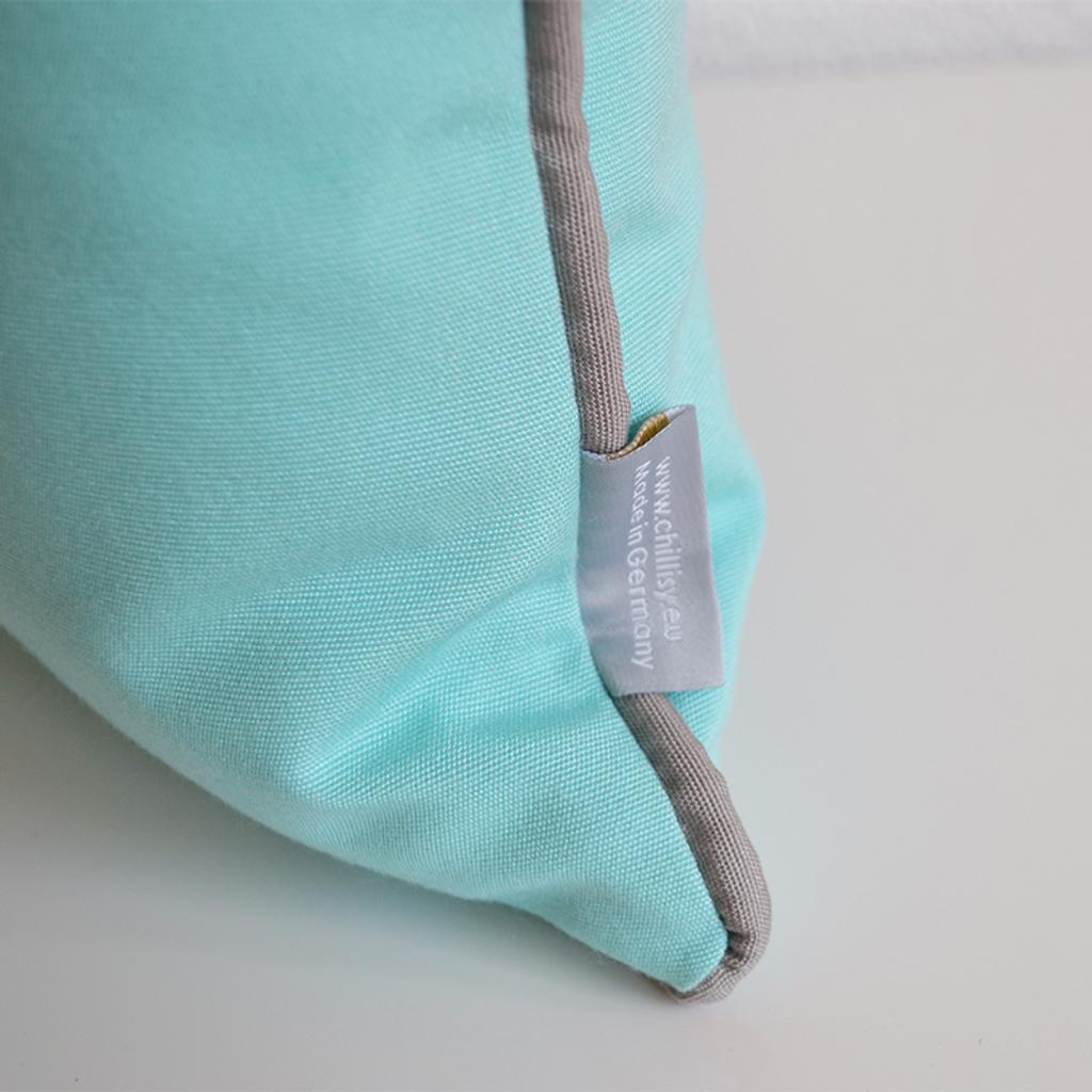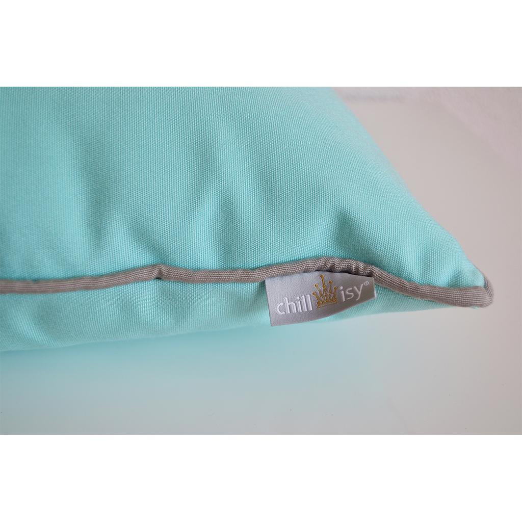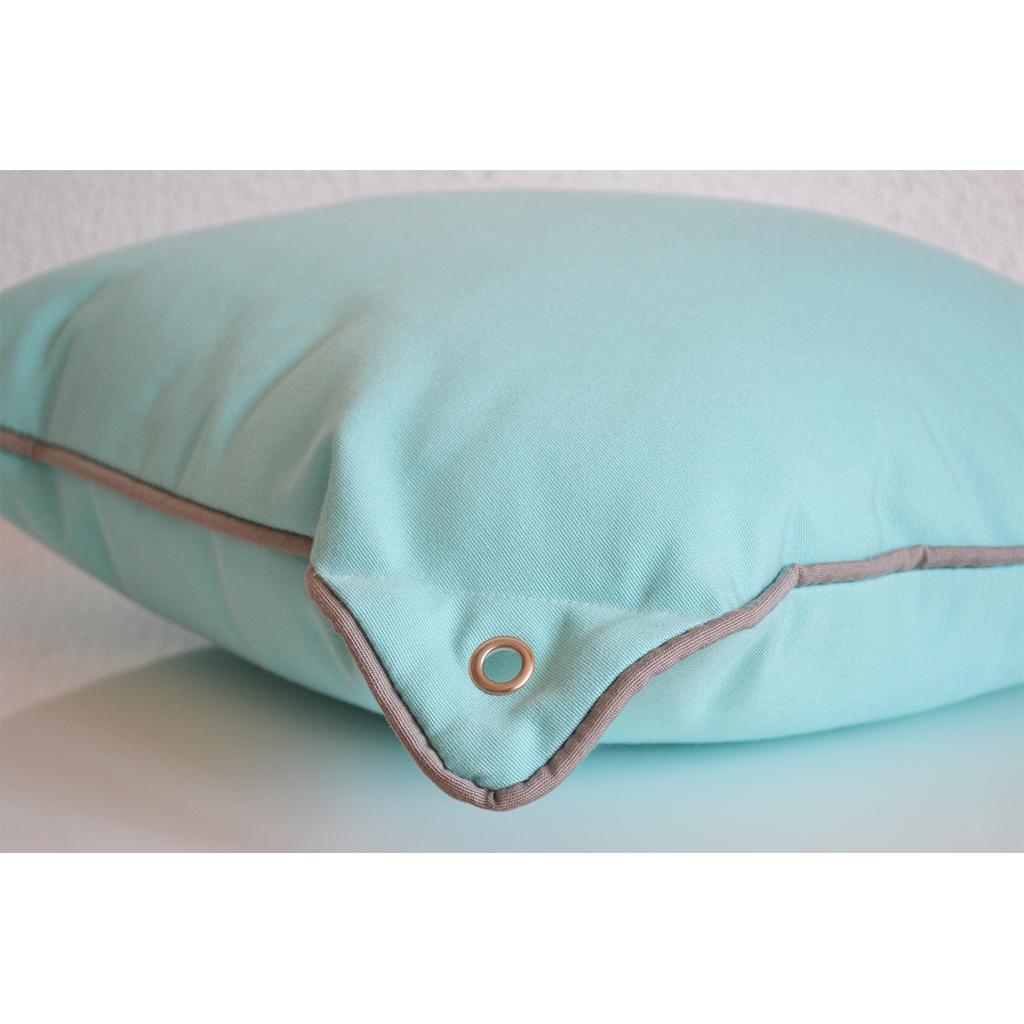 Kissen für Yacht und Boot in der wunderschönen Farbe Mint. Umrahmt an allen vier Seiten ist das Kissen von einem grauem Keder. Die Haptik des Stoffes ist kuschelig weich, angenehm auf der Haut.