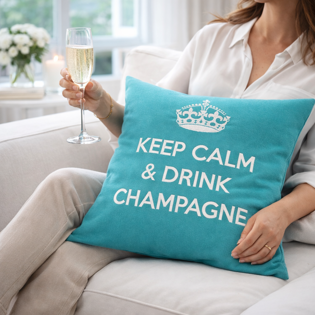 Dekoratives Zierkissen in frischem Türkis mit hochwertiger, weißer Stickerei. Das Motiv zeigt eine Krone über dem Schriftzug "KEEP CALM & DRINK CHAMPAGNE".