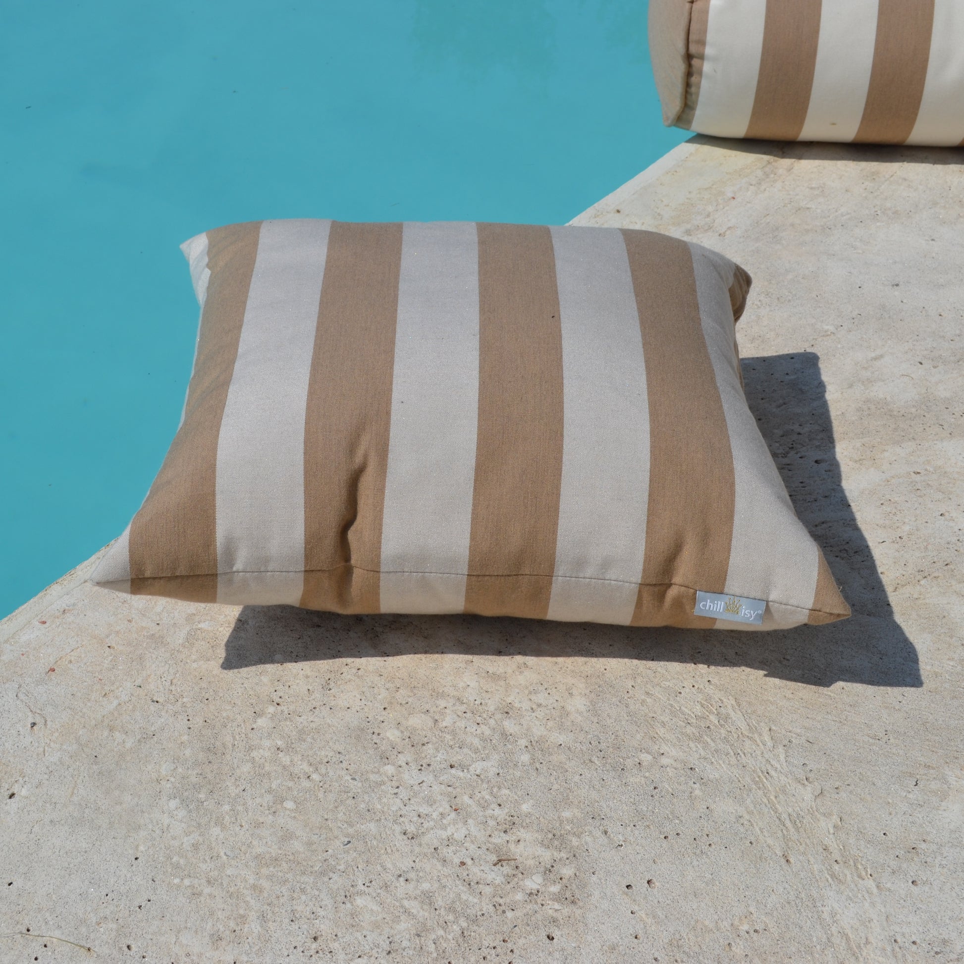 Wunderschöne Kissen im beigen Blockstreifen Design, aus hochwertigem Outdoor Textil gefertigt. Das Gartenkissen kann ebenso als Sofakissen oder Yachtkissen verwendet werden. Die Kissenhülle hat einen Reißverschluss und wird mit Füllung geliefert.