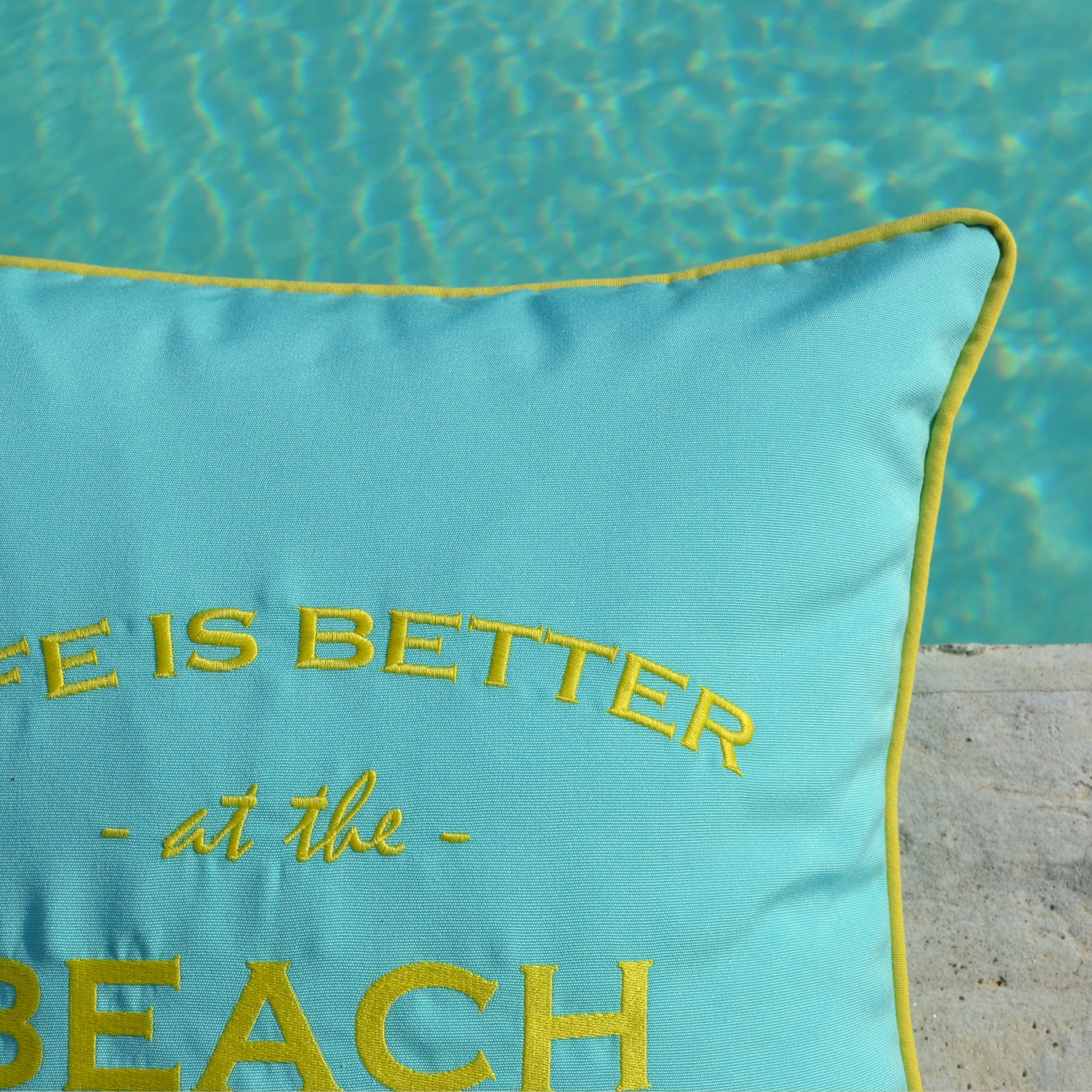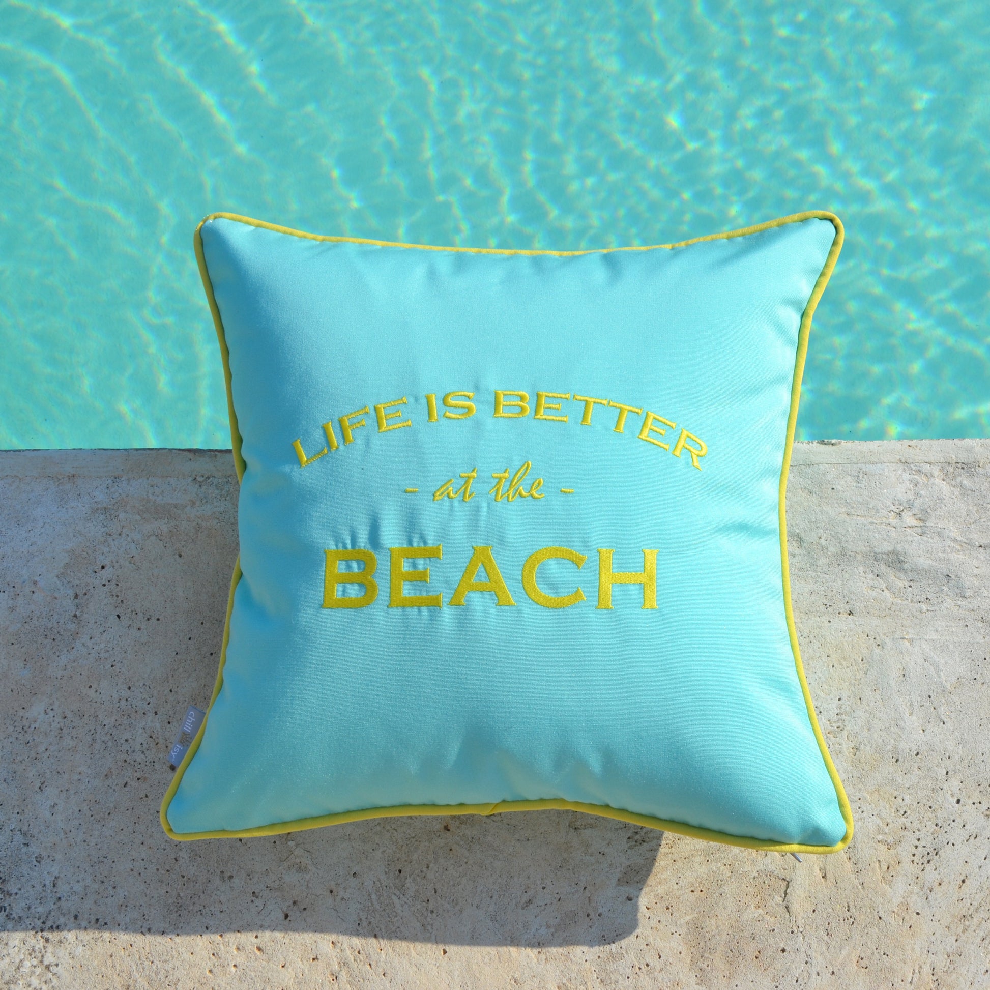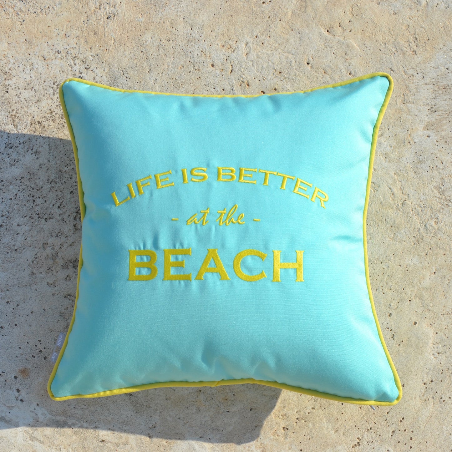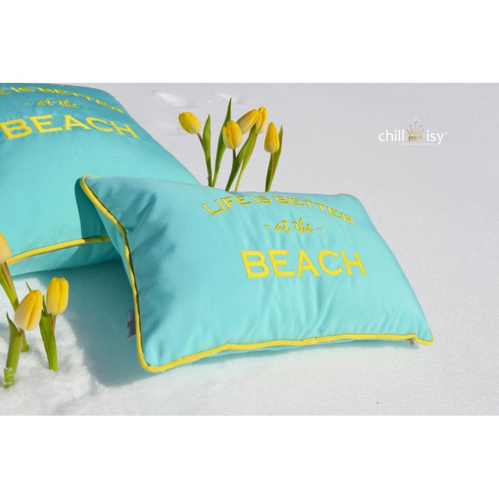 Mint farbenes Kissen in Limonen Gelb bestickt "LIFE IS BETTER AT THE BEACH". Für Strandliebhaber, die ein bisschen Beach Feeling zu Hause bevorzugen.