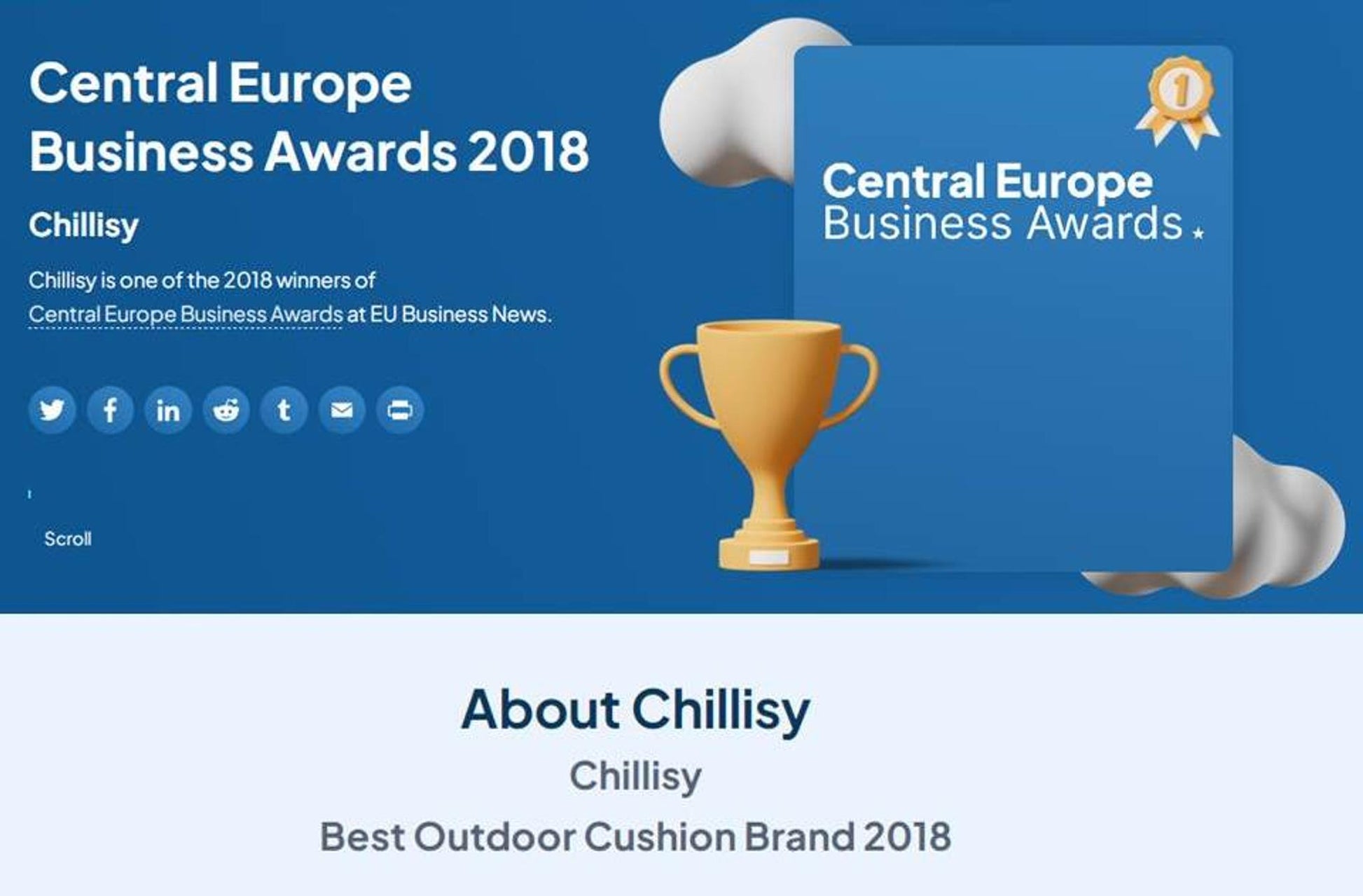 Die Marke chillisy® wurde honoriert mit dem Award „Best Outdoor Cushion Brand 2018“ des Central Europe Business.  Dem German Design Award Special 2019 für das chillisy® Premium Poolkissen sowie dem Touristic-Award für den Best-Top-Partner 2018.