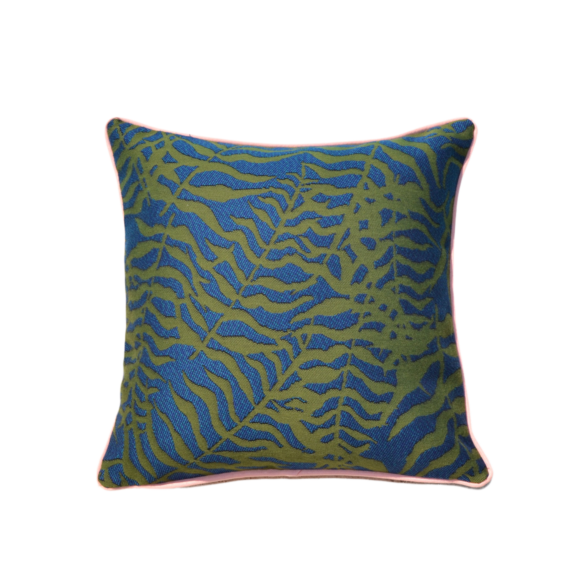 Dekoratives Kissen im floralen Ikebana Bayou Design. Die Vorderseite ist in Marine Blau mit grünen Blätter Motiven gehalten. Die Rückseite sowie die vierseitige Kederumrandung ist komplett in Rosa gestaltet.