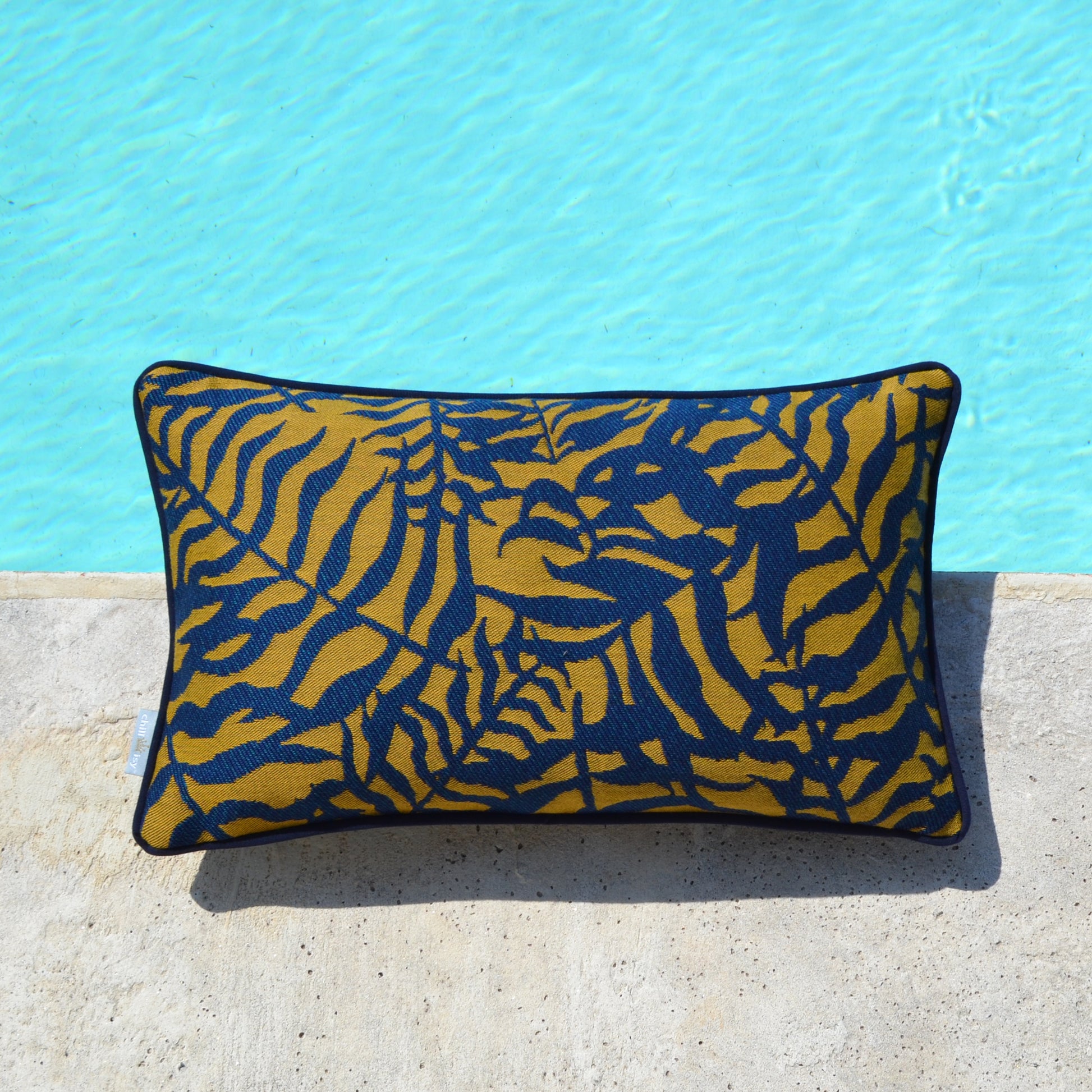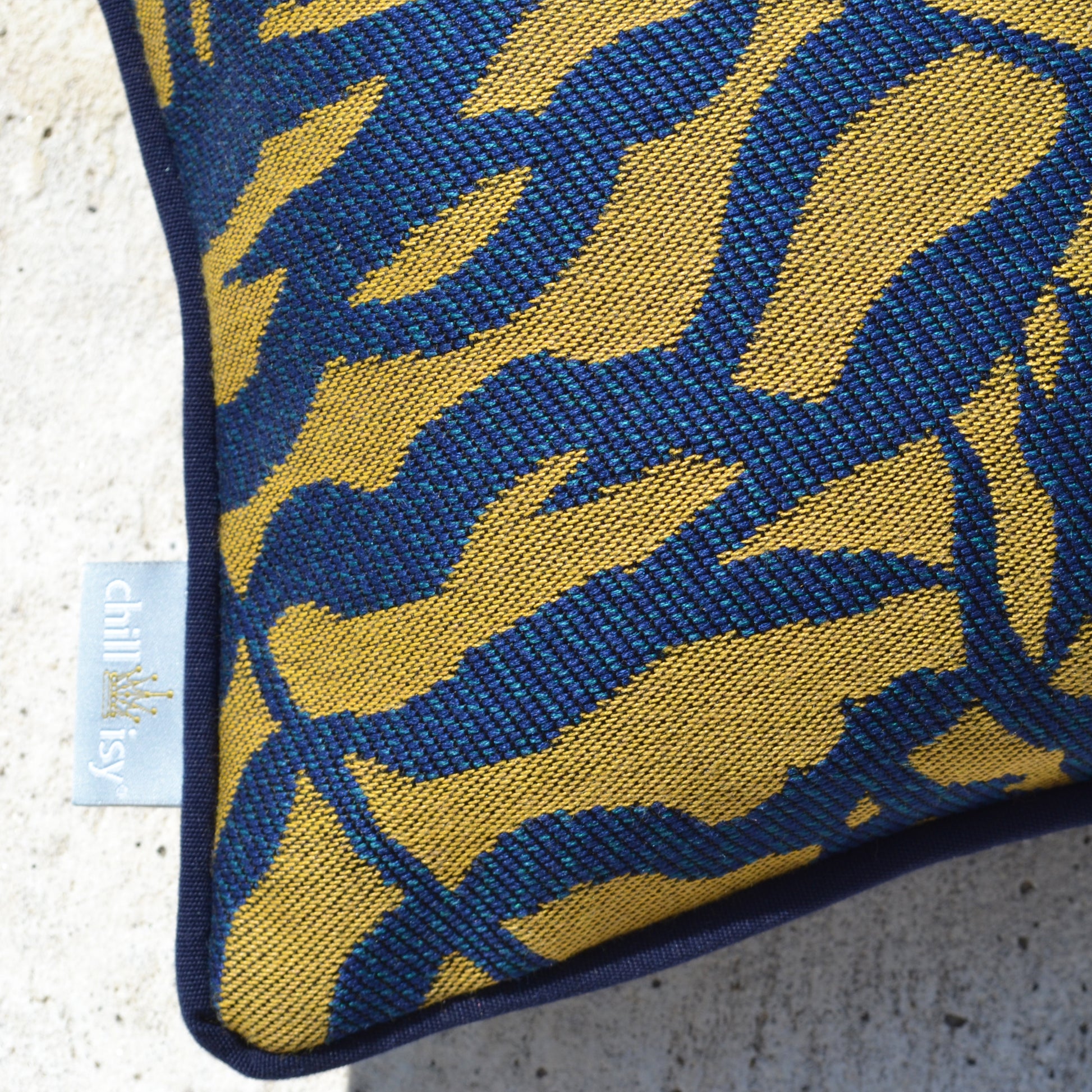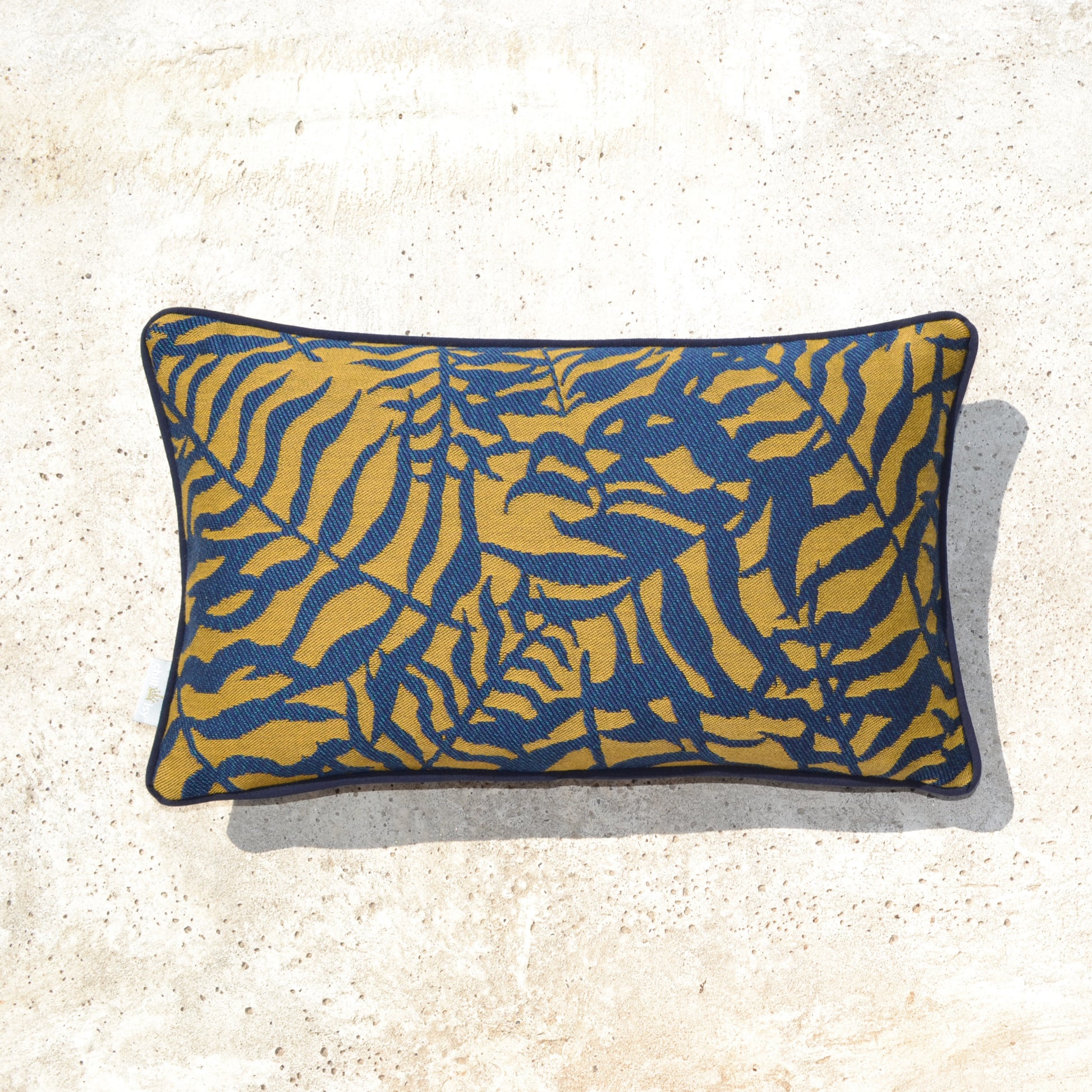 Dekoratives Kissen im floralen Ikebana Safari Design. Die Vorderseite ist in kräftigem Beige mit blauen Blätter Motiven gehalten. Die Rückseite sowie die vierseitige Kederumrandung ist komplett in Marine Blau gehalten.