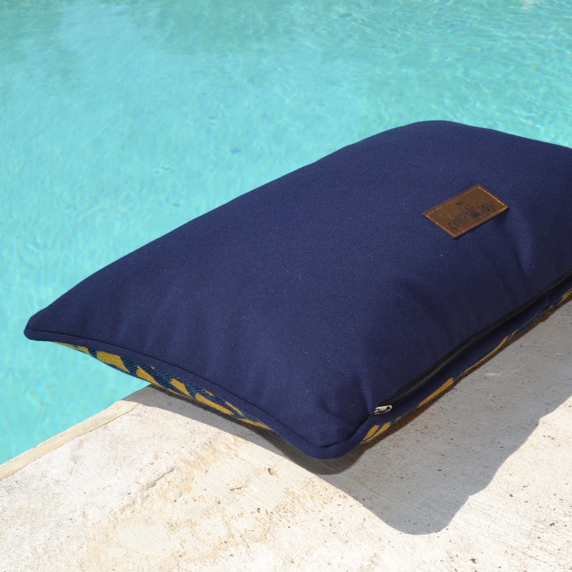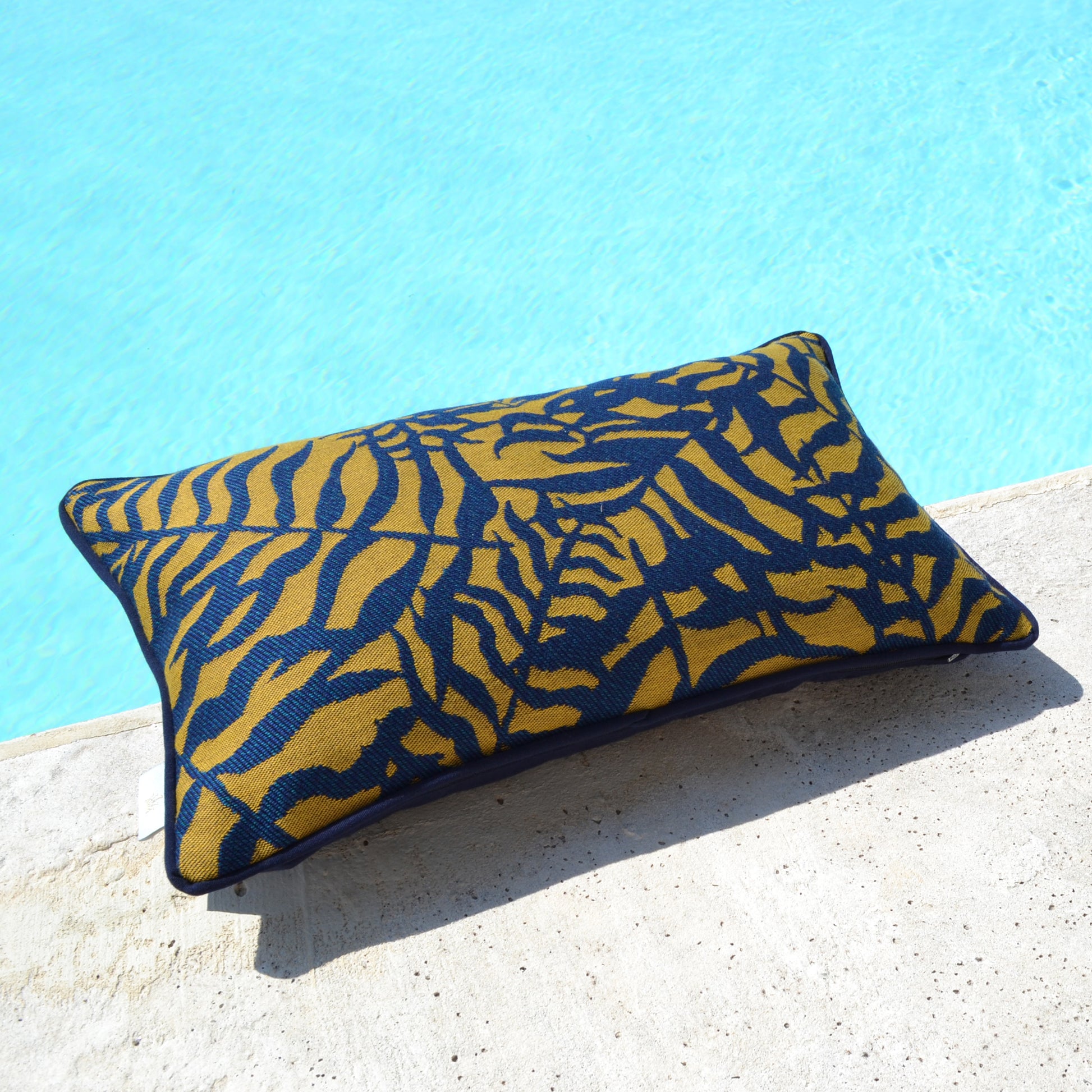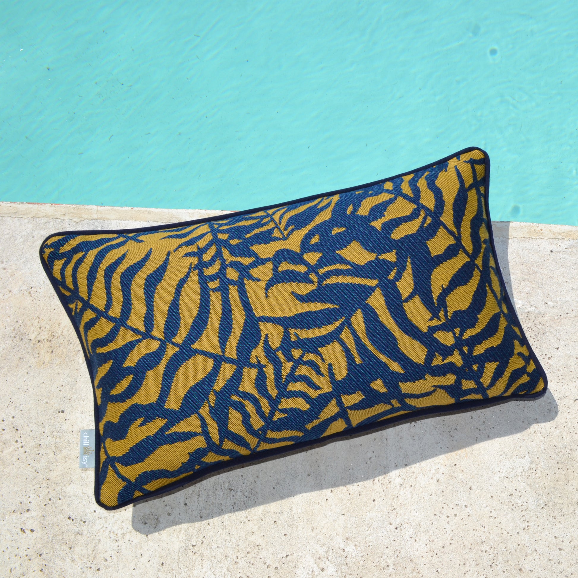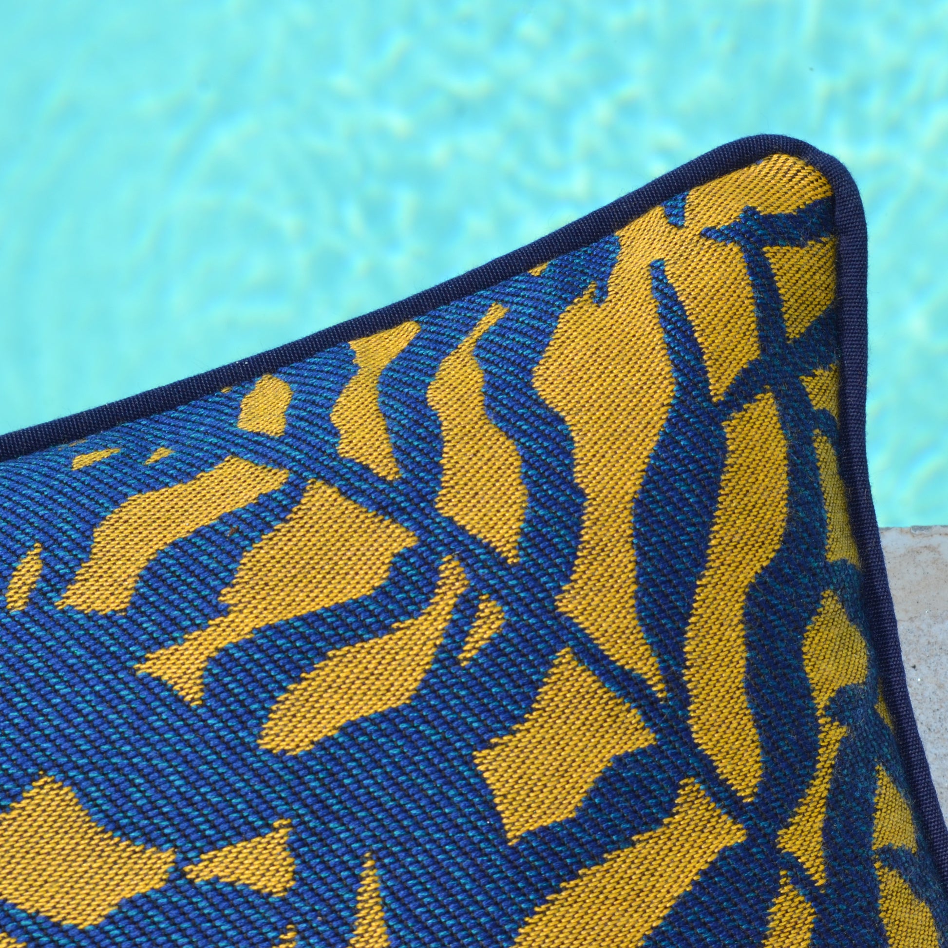 Dekoratives Kissen im floralen Ikebana Safari Design. Die Vorderseite ist in kräftigem Beige mit blauen Blätter Motiven gehalten. Die Rückseite sowie die vierseitige Kederumrandung ist komplett in Marine Blau gehalten.