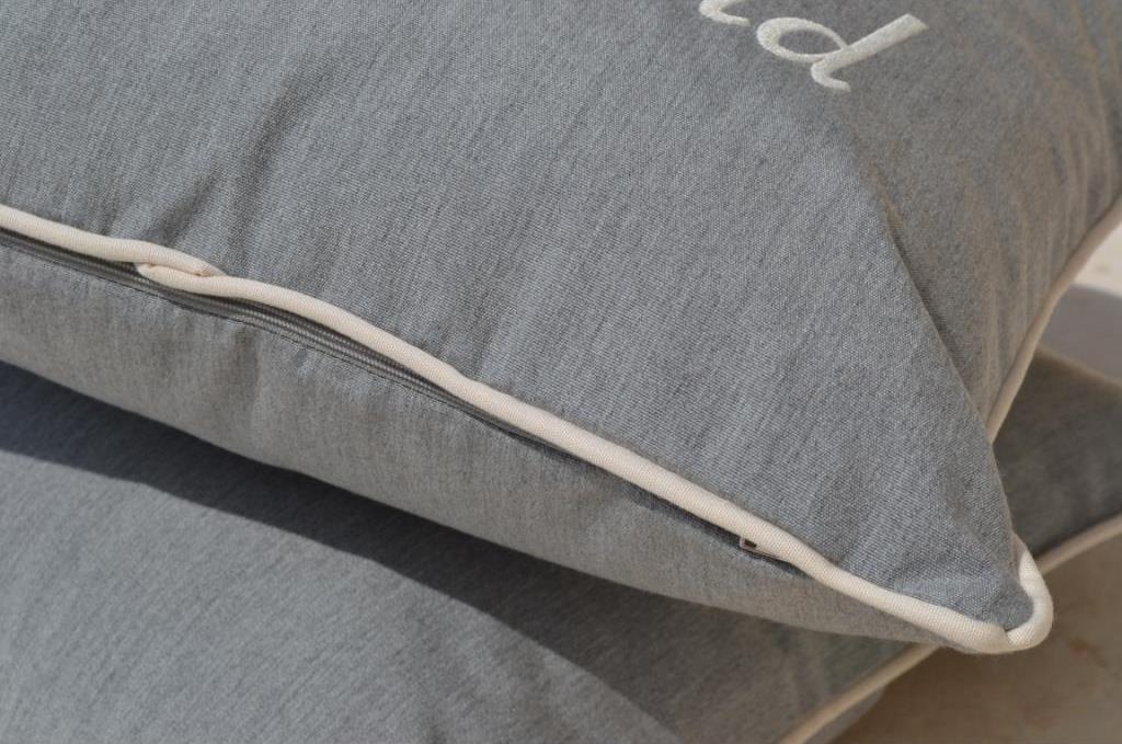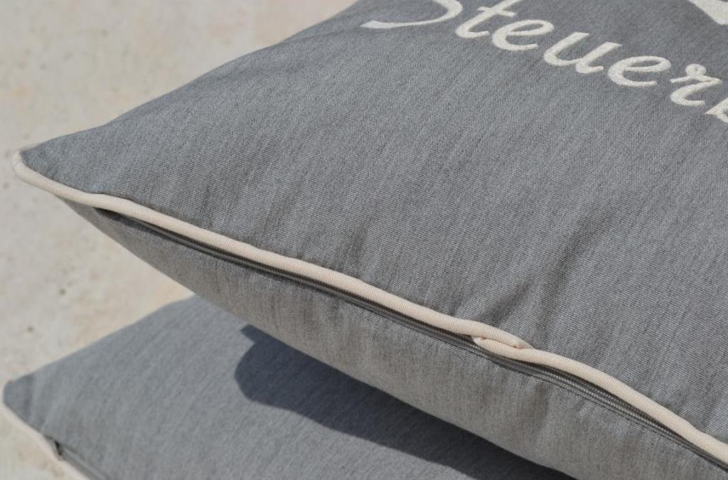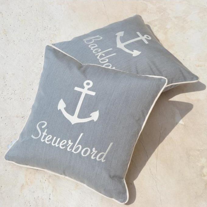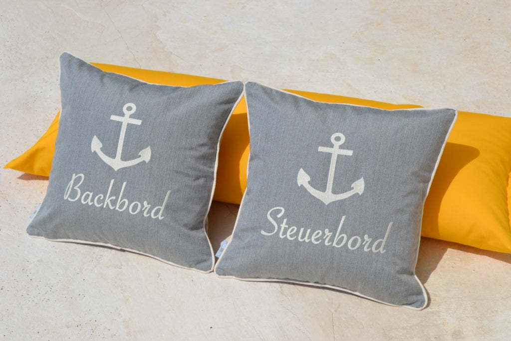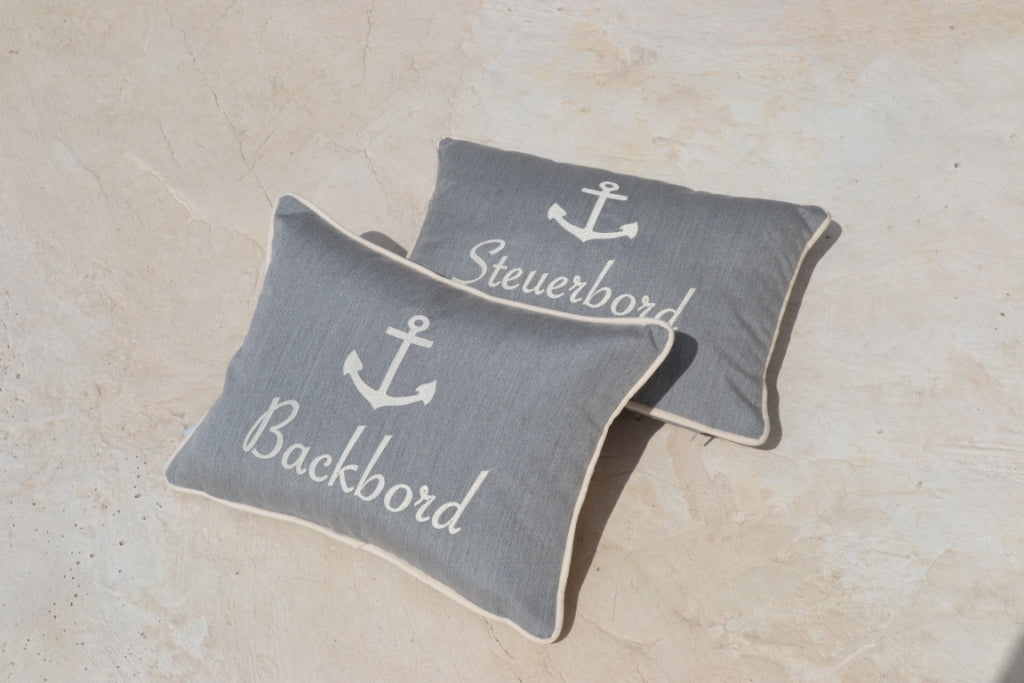 Yachtkissen mit der Aufschrift BACKBORD und STEUERBORD in der Farbe Cremeweiß auf Steingrau - sozusagen Grau Melange - hochwertig gestickt. Wunderschöne vierseitige Paspel-Umrandung in Cremeweiß greift farblich die Stickerei wieder auf.