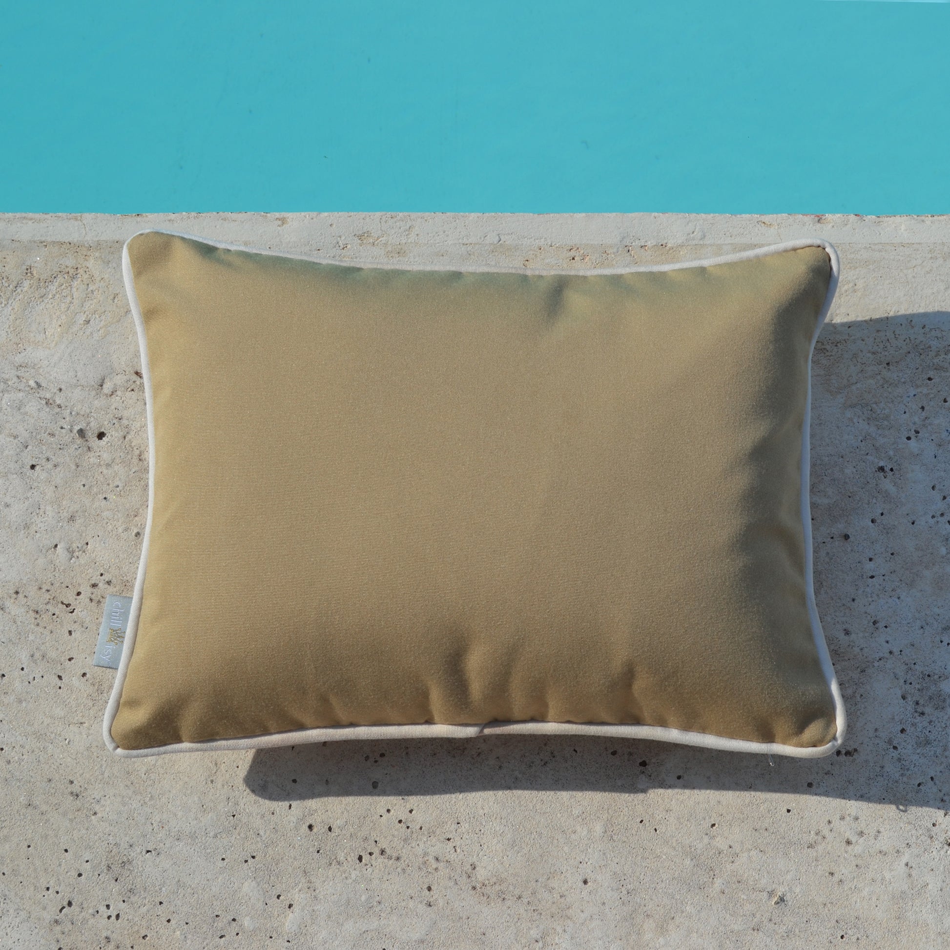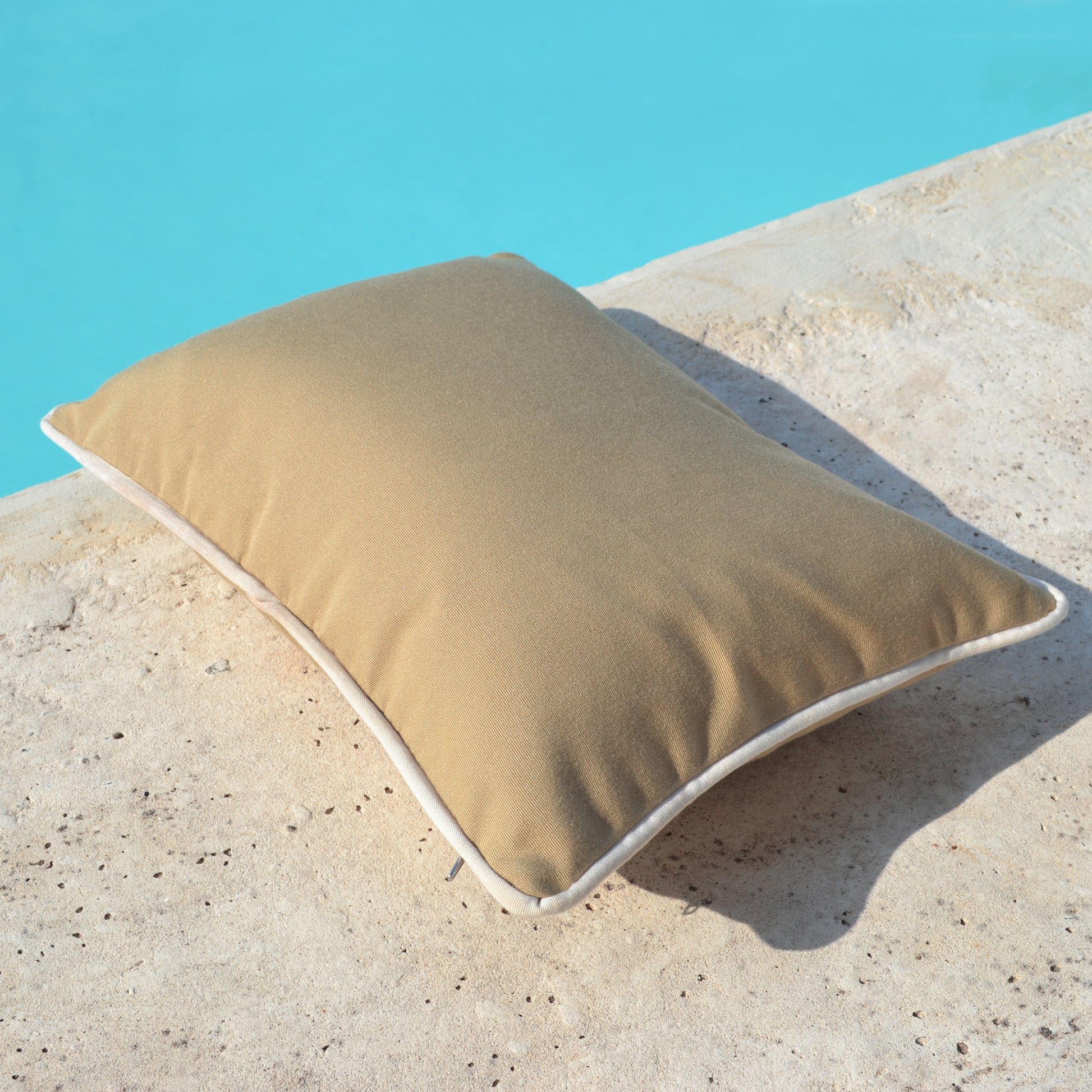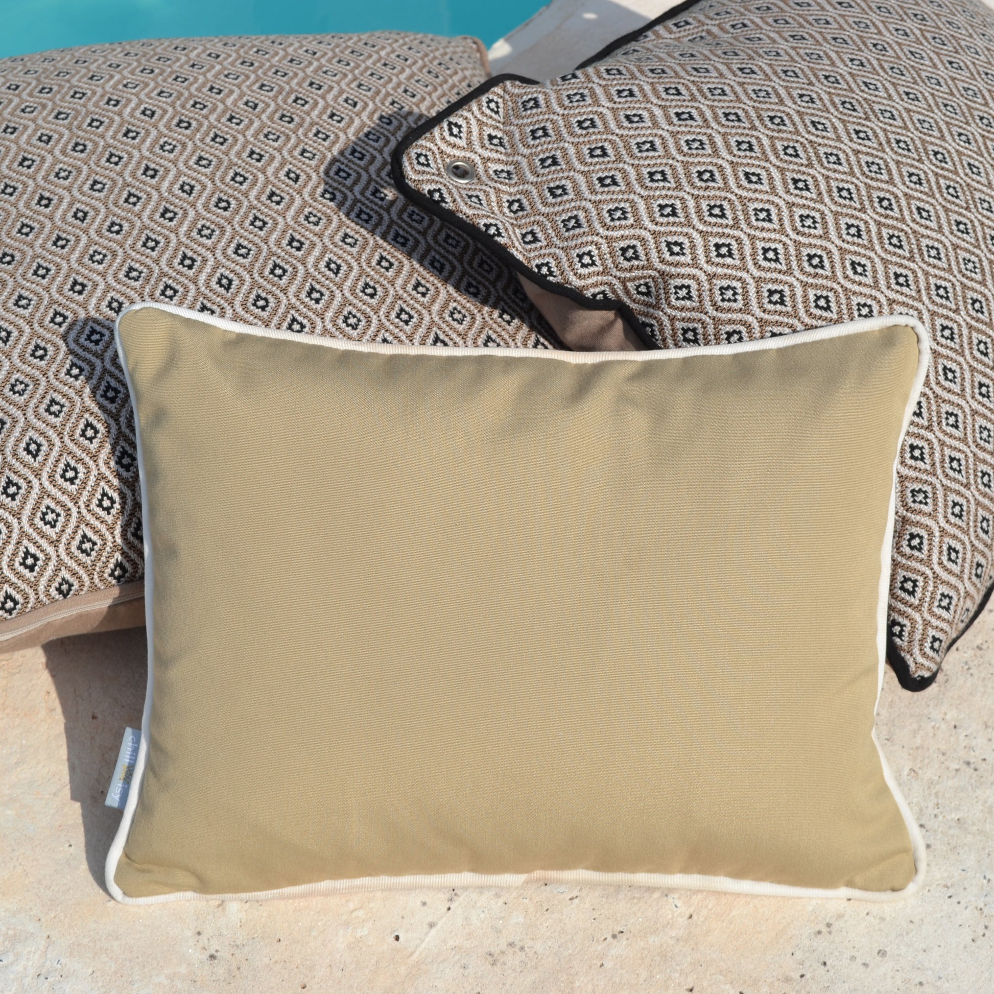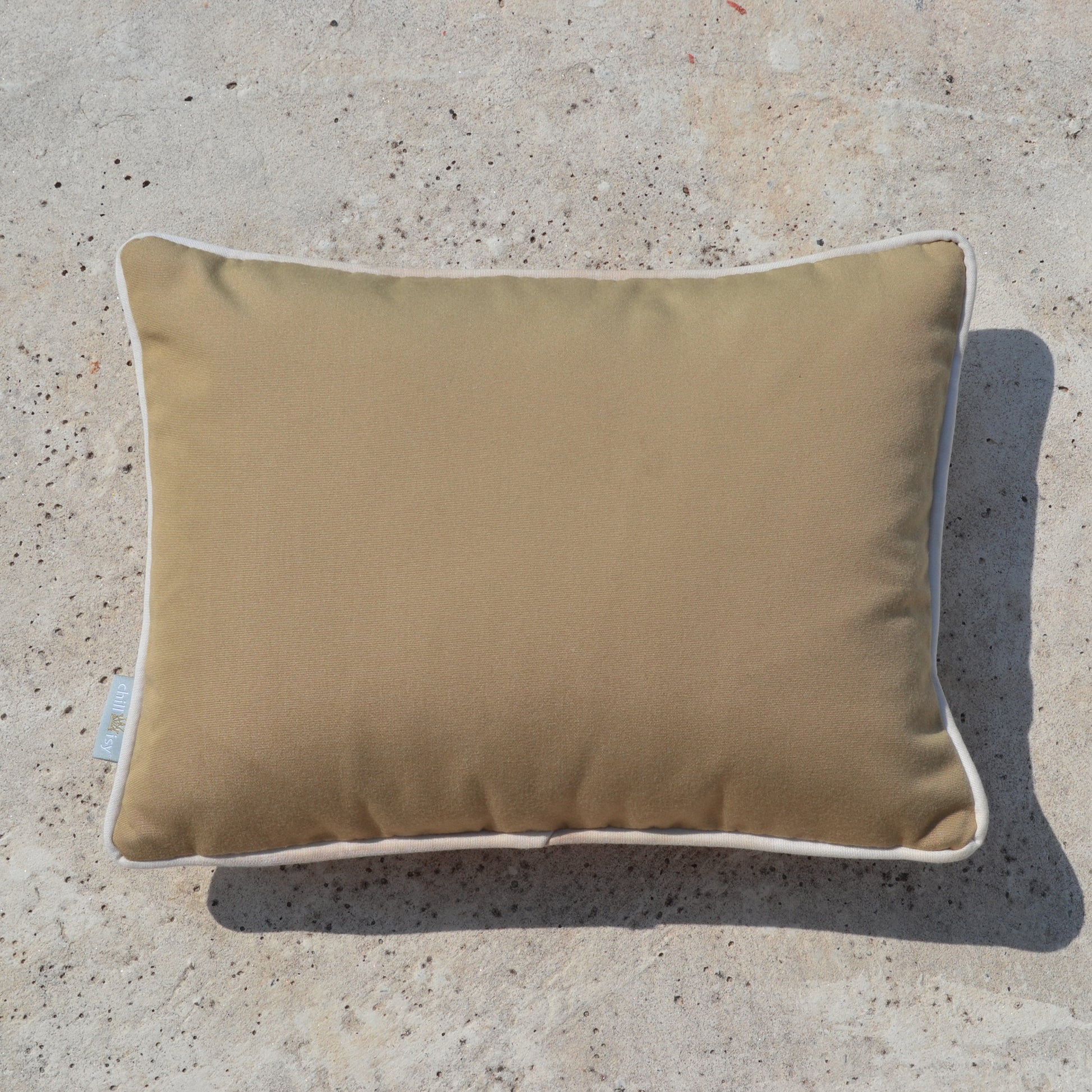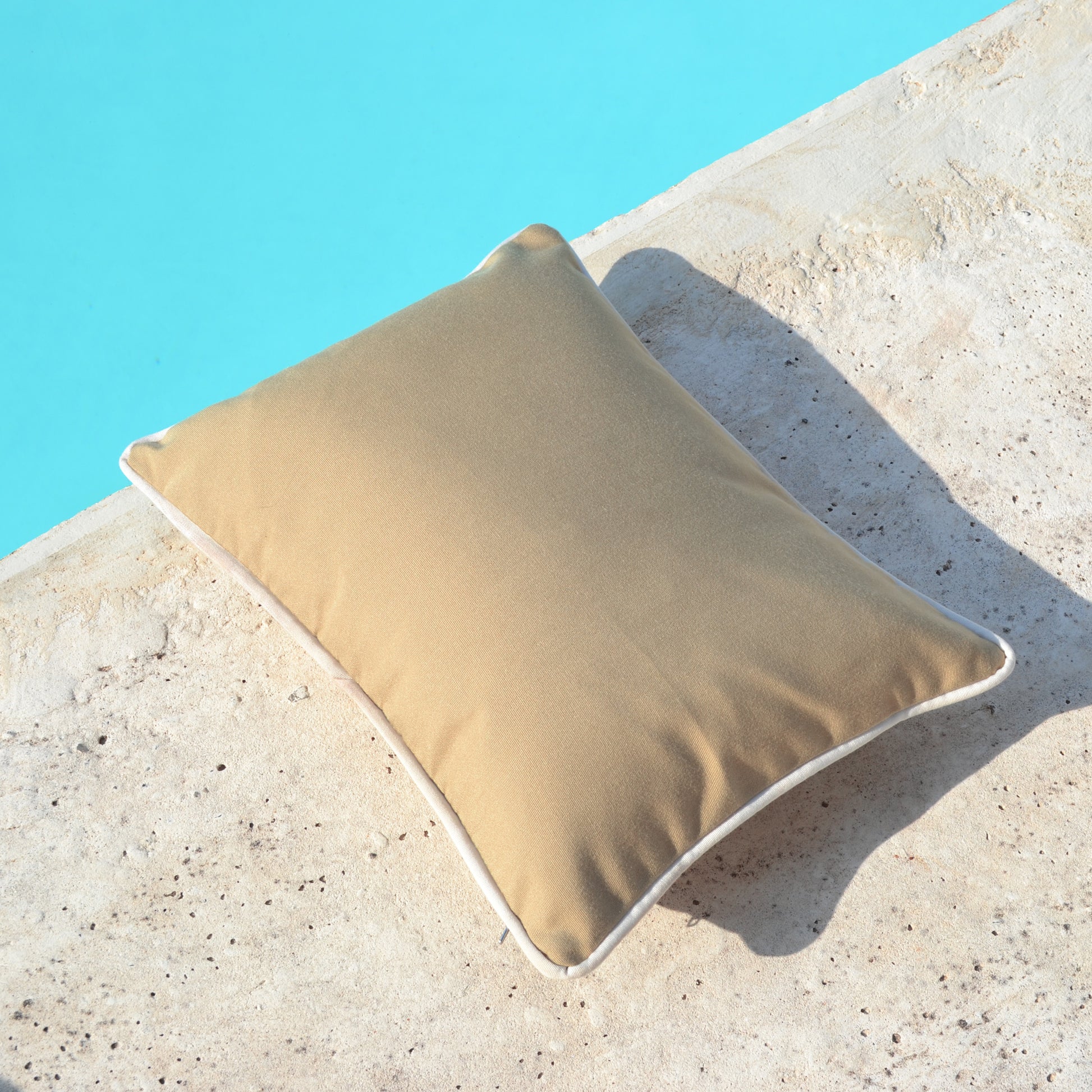 Cushion in a beautiful beige, reminiscent of caramelized butter, bordered by a four-sided piping in white.
