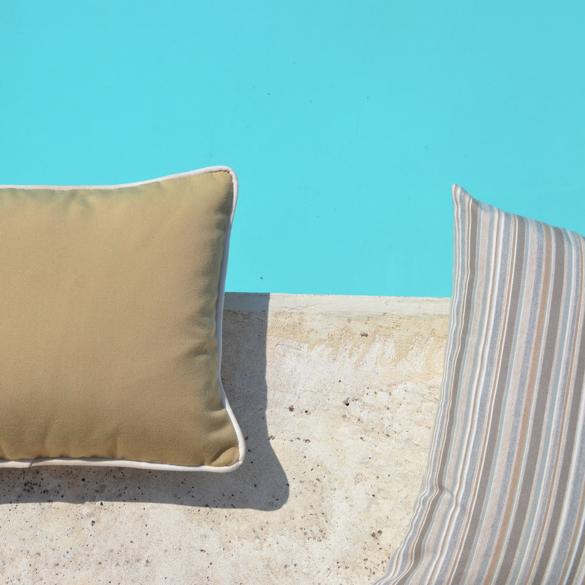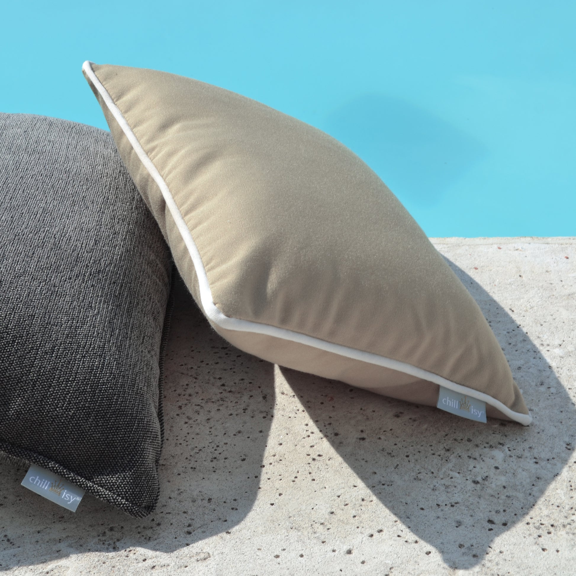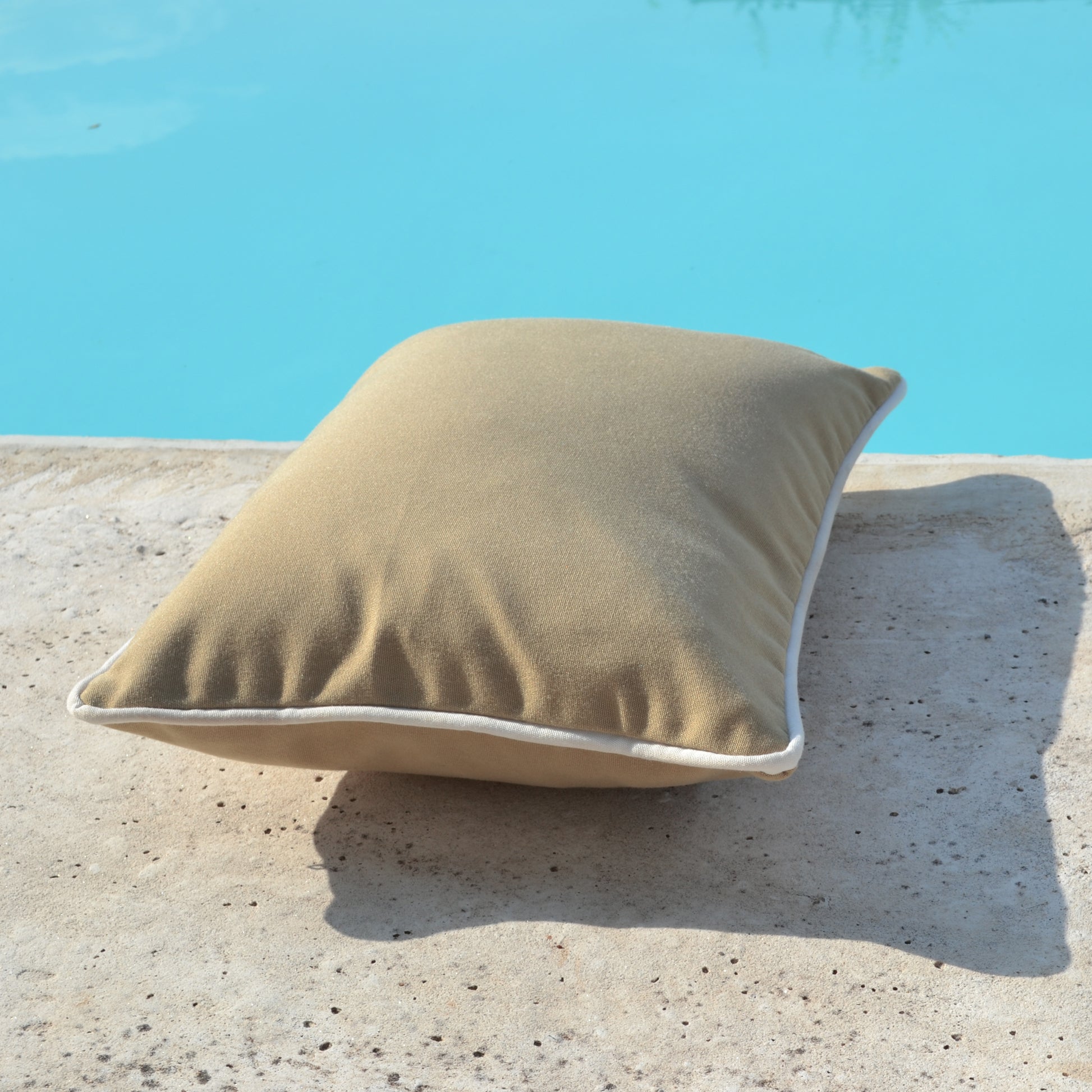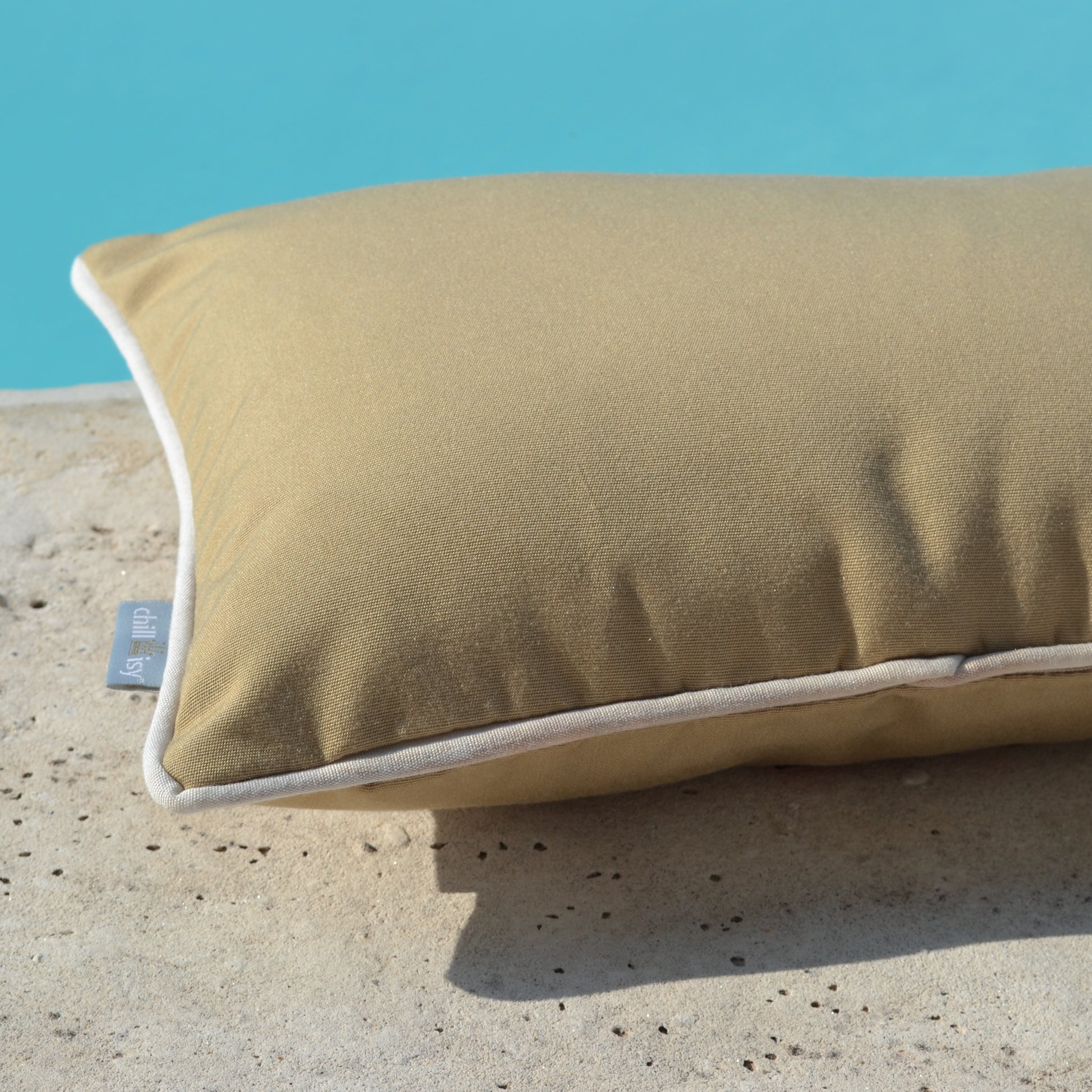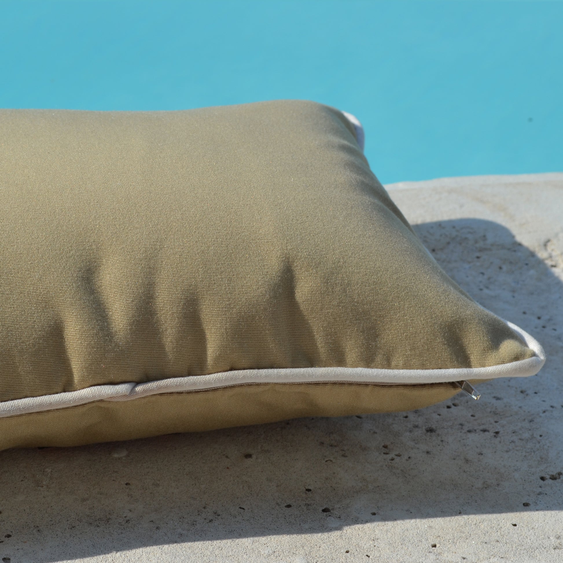 Cushion in a beautiful beige, reminiscent of caramelized butter, bordered by a four-sided piping in white.
