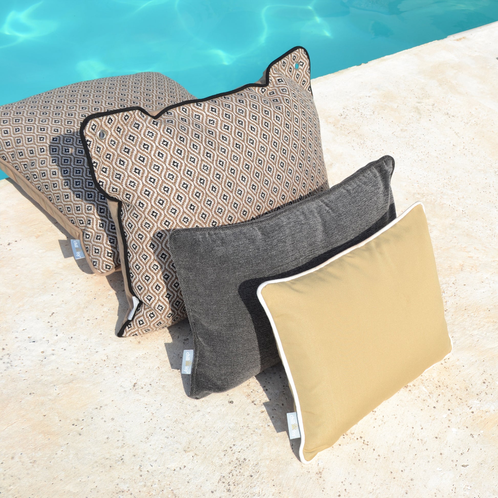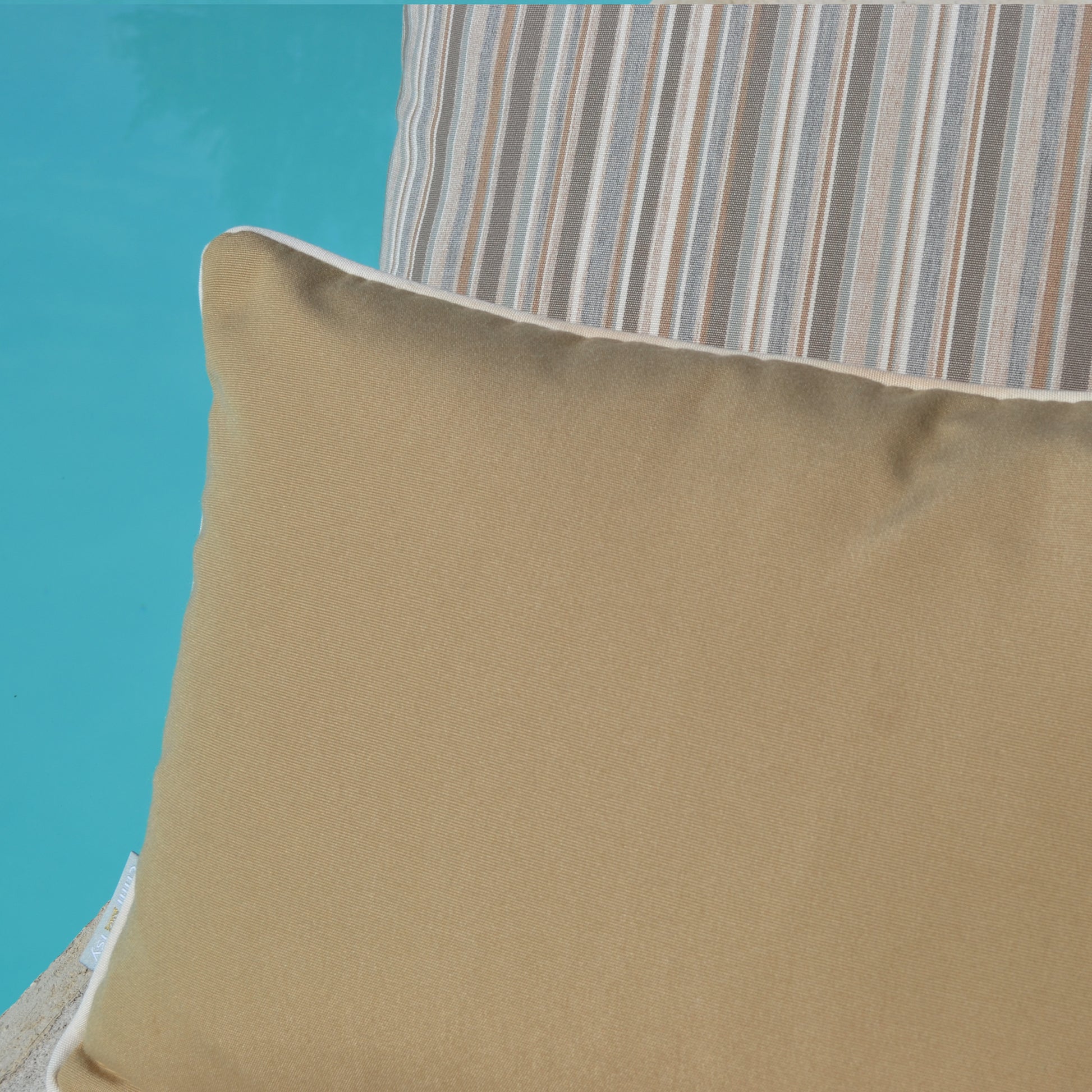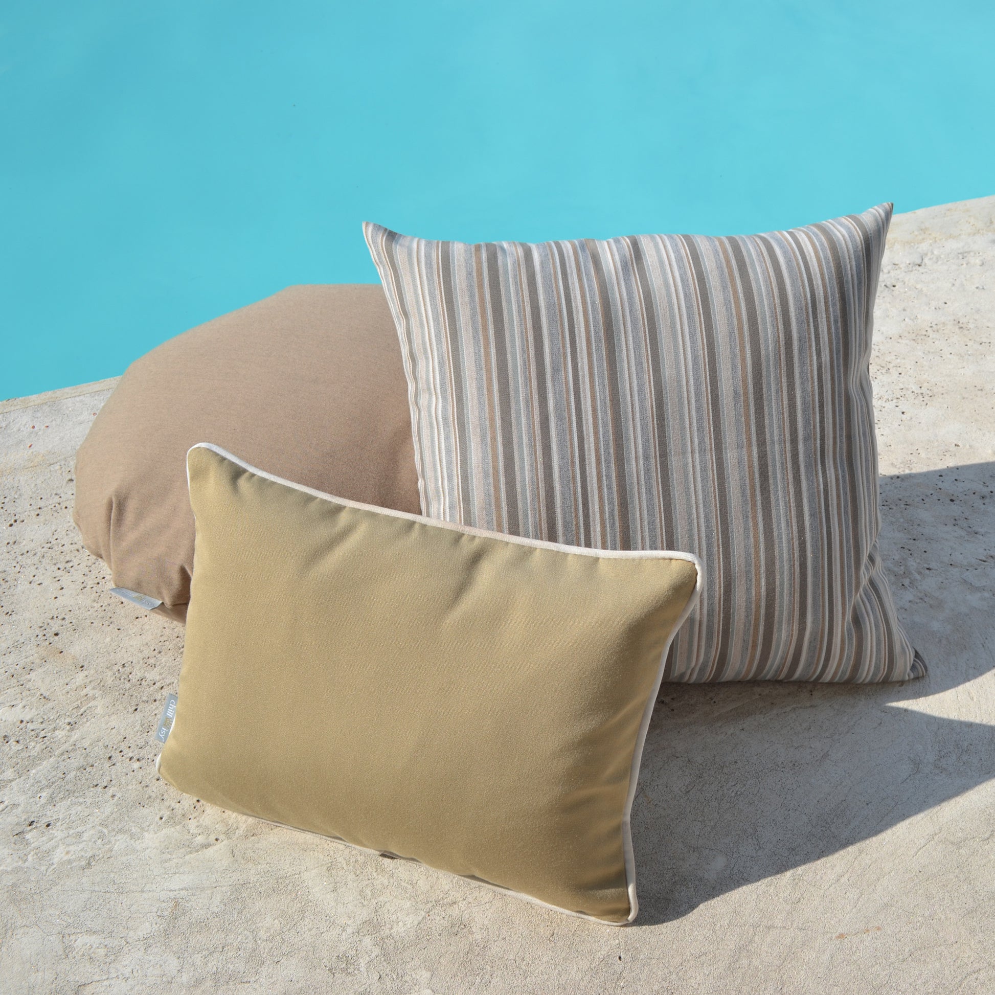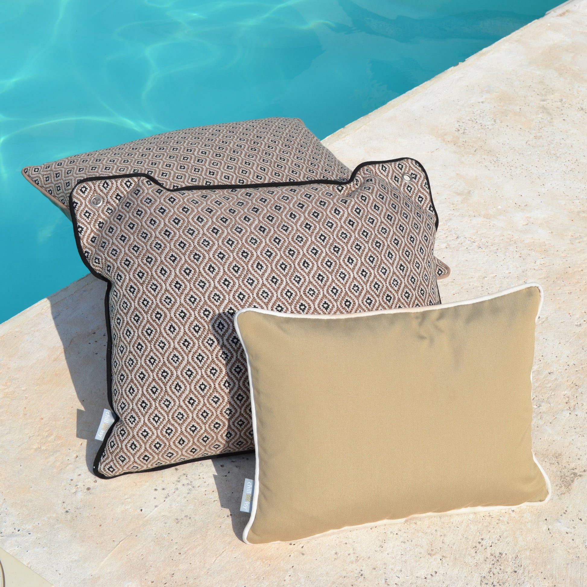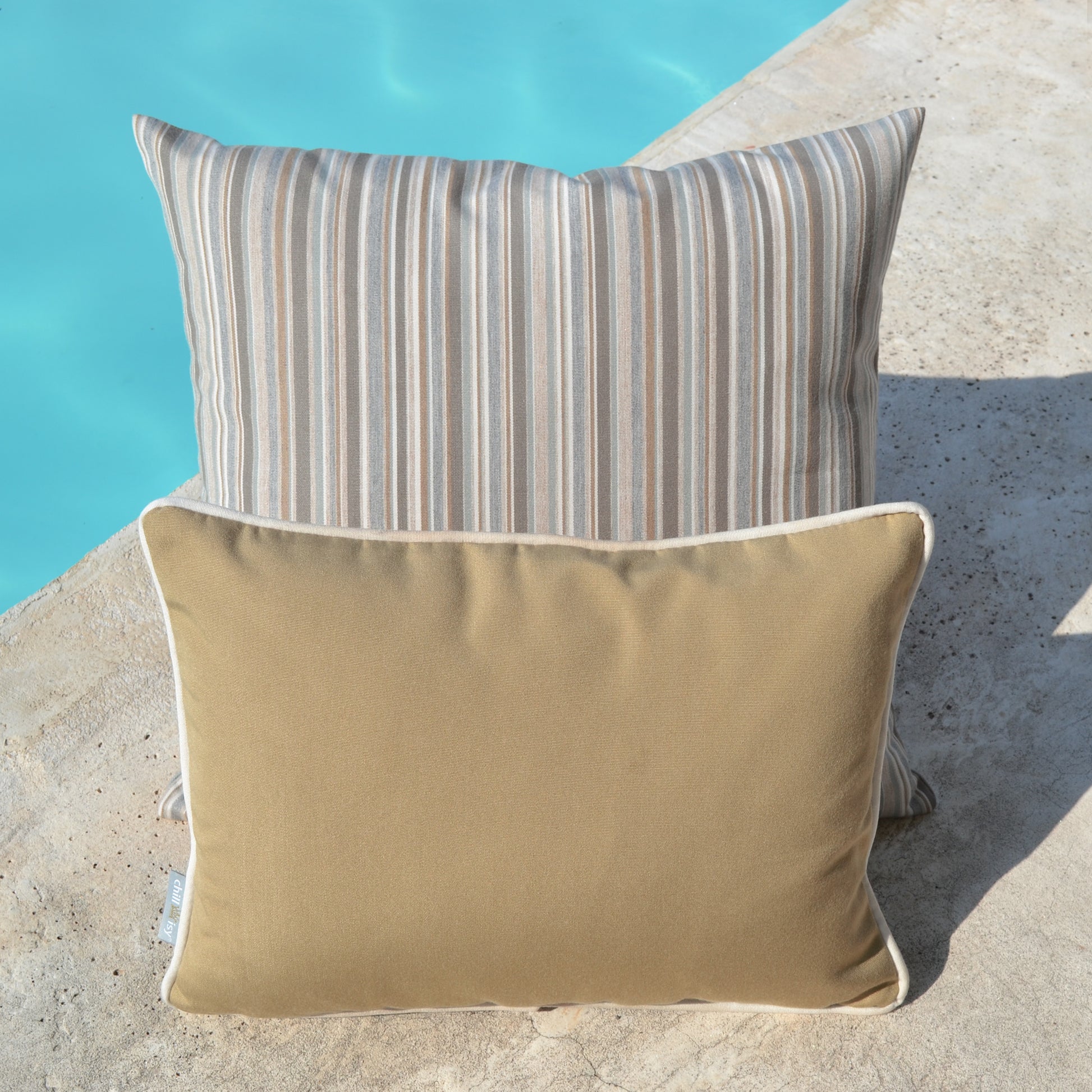 Cushion in a beautiful beige, reminiscent of caramelized butter, bordered by a four-sided piping in white.
