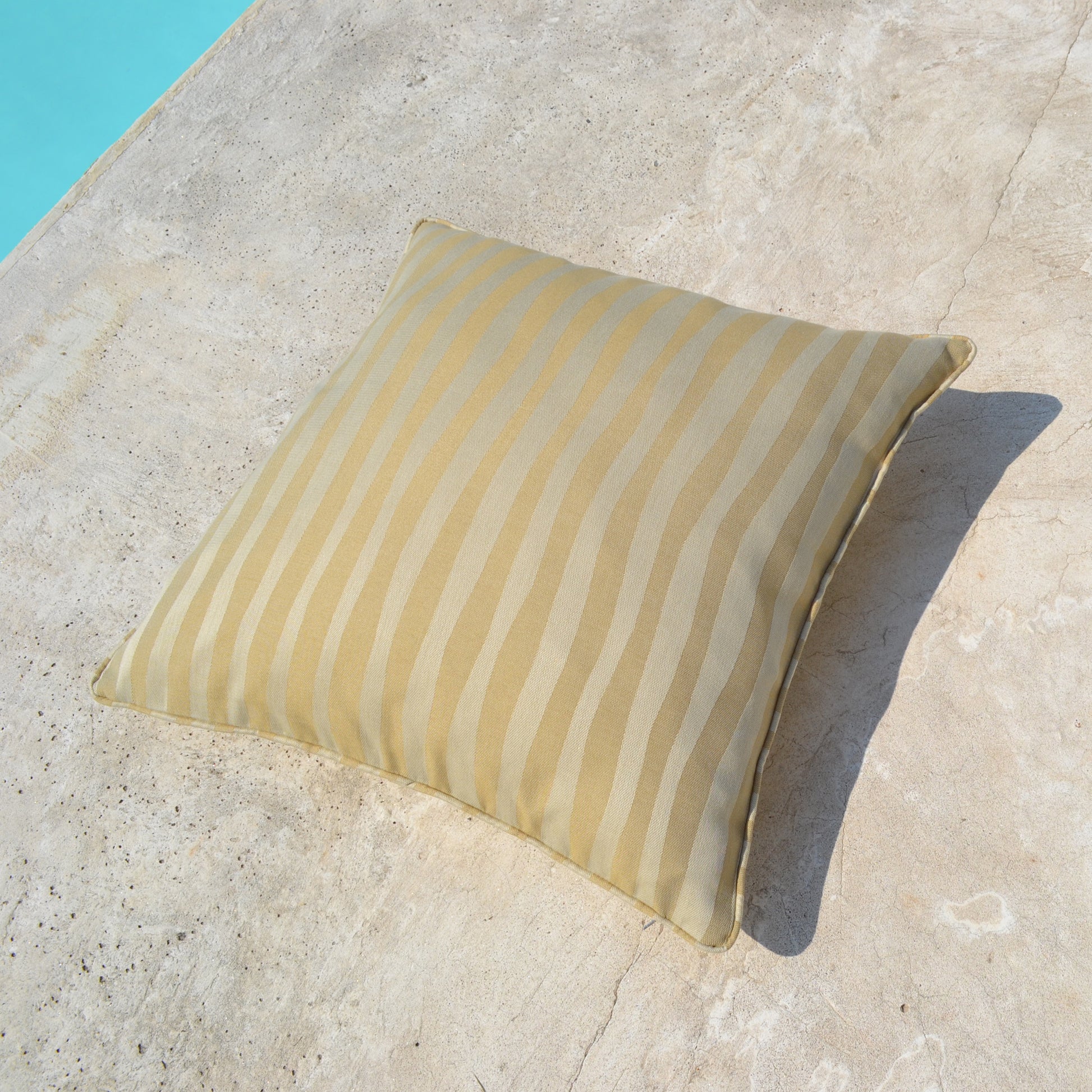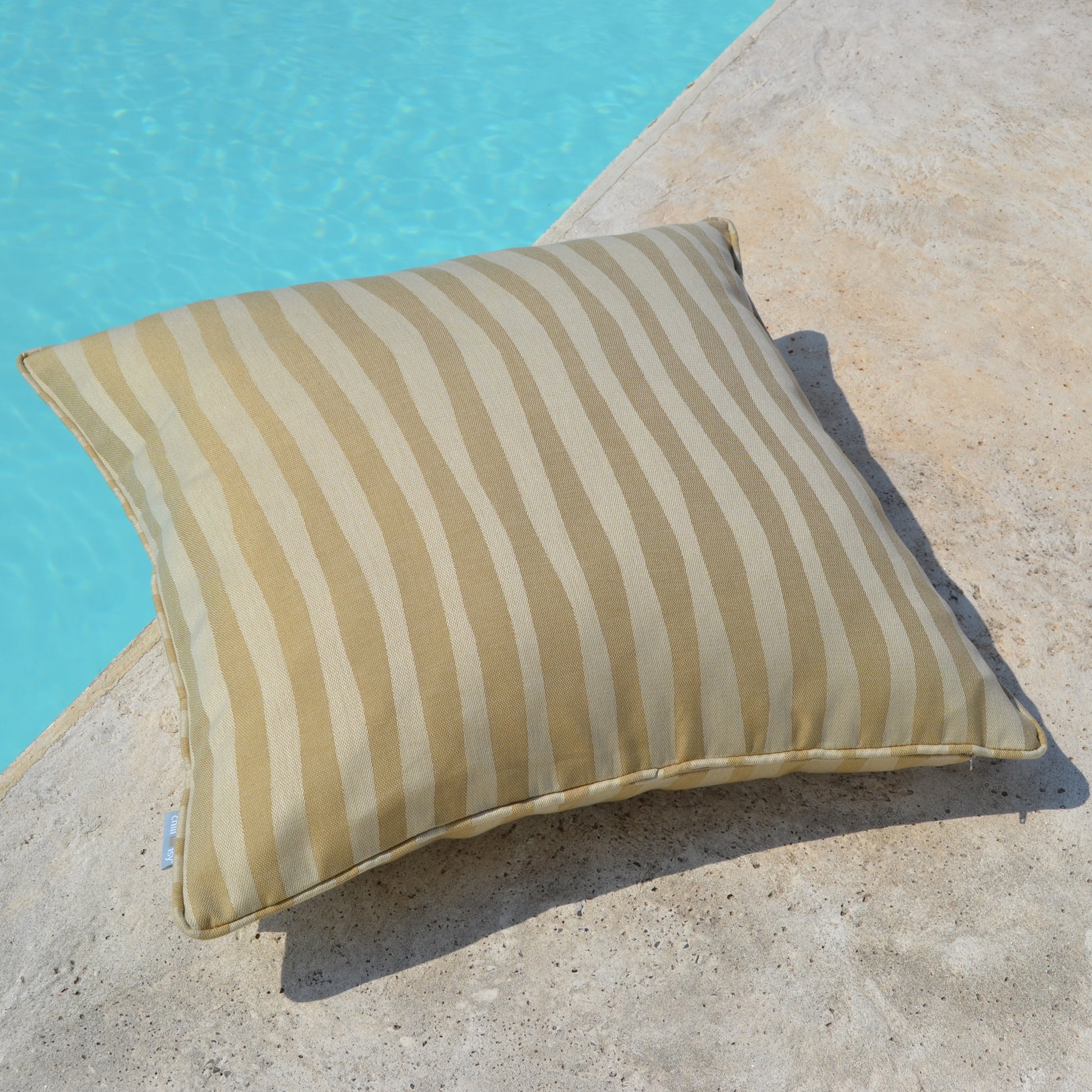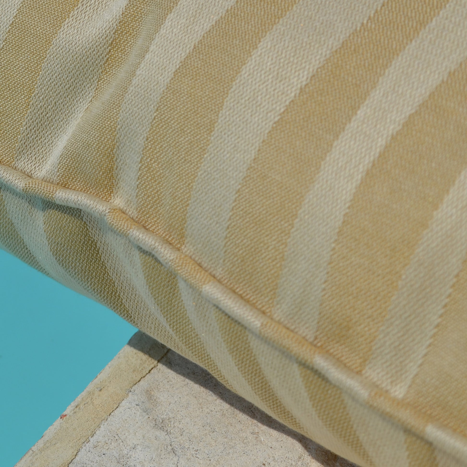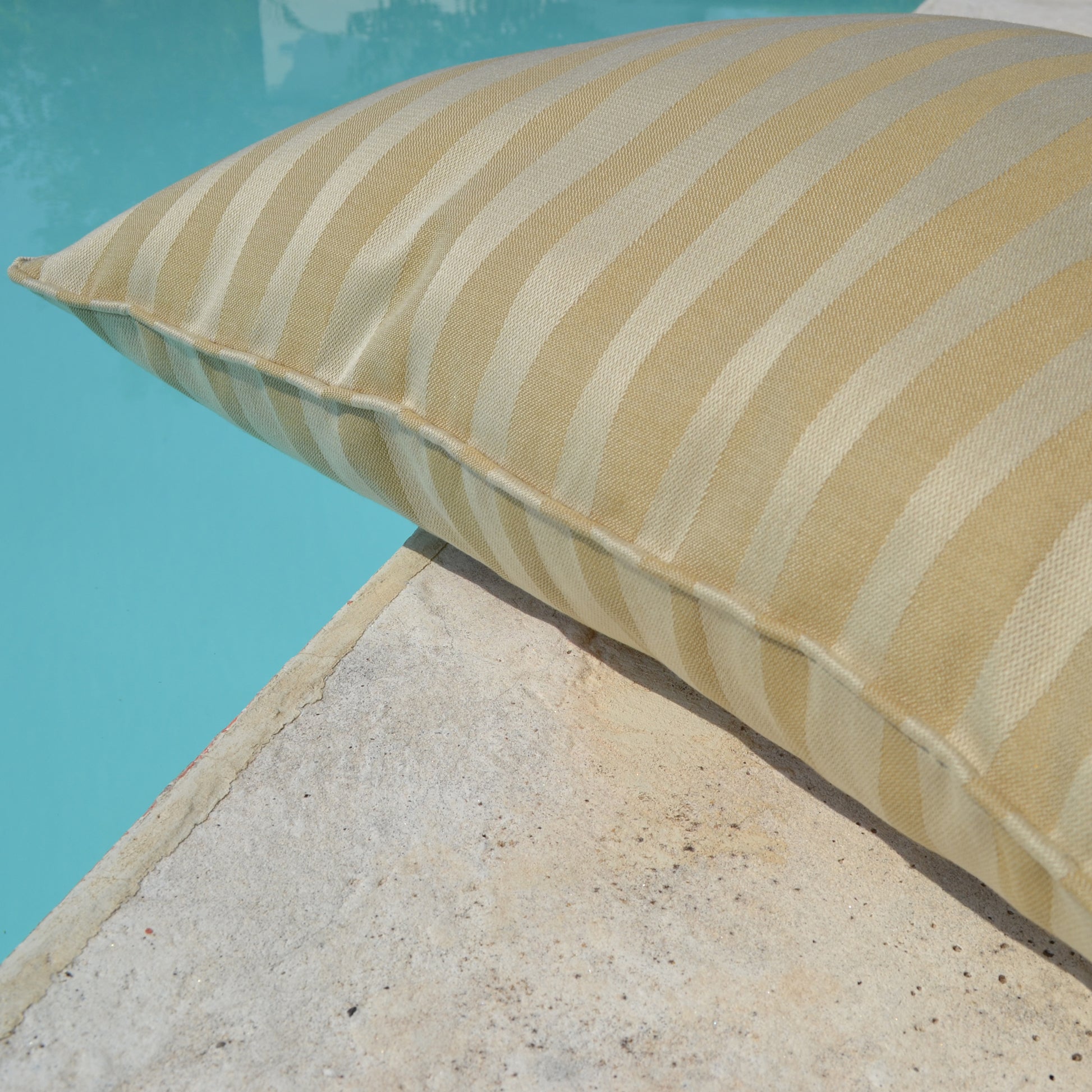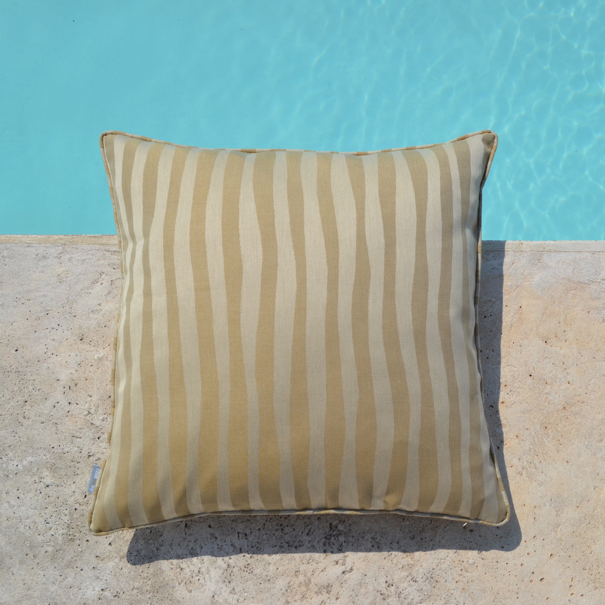 Cushion in a beige, sand-colored wave design. Made from jacquard fabric. This cushion collection, like all chillisy cushions, is extremely weather-resistant. The high quality of the fabrics means they do not fade. Rainwater beads off of them.