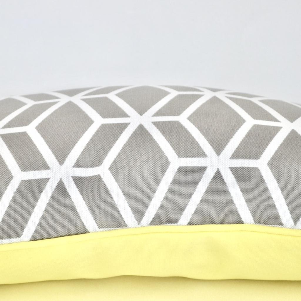 Bringen Sie sommerliche Frische in Ihren Wohn- und Außenbereich mit dem Outdoor Kissen Calvia in Grau und Limonen Gelb. Die moderne Farbkombination und das geometrische Design machen dieses Dekokissen für Garten, Terrasse und Balkon zu einem stilvollen Blickfang – sowohl draußen als auch drinnen.