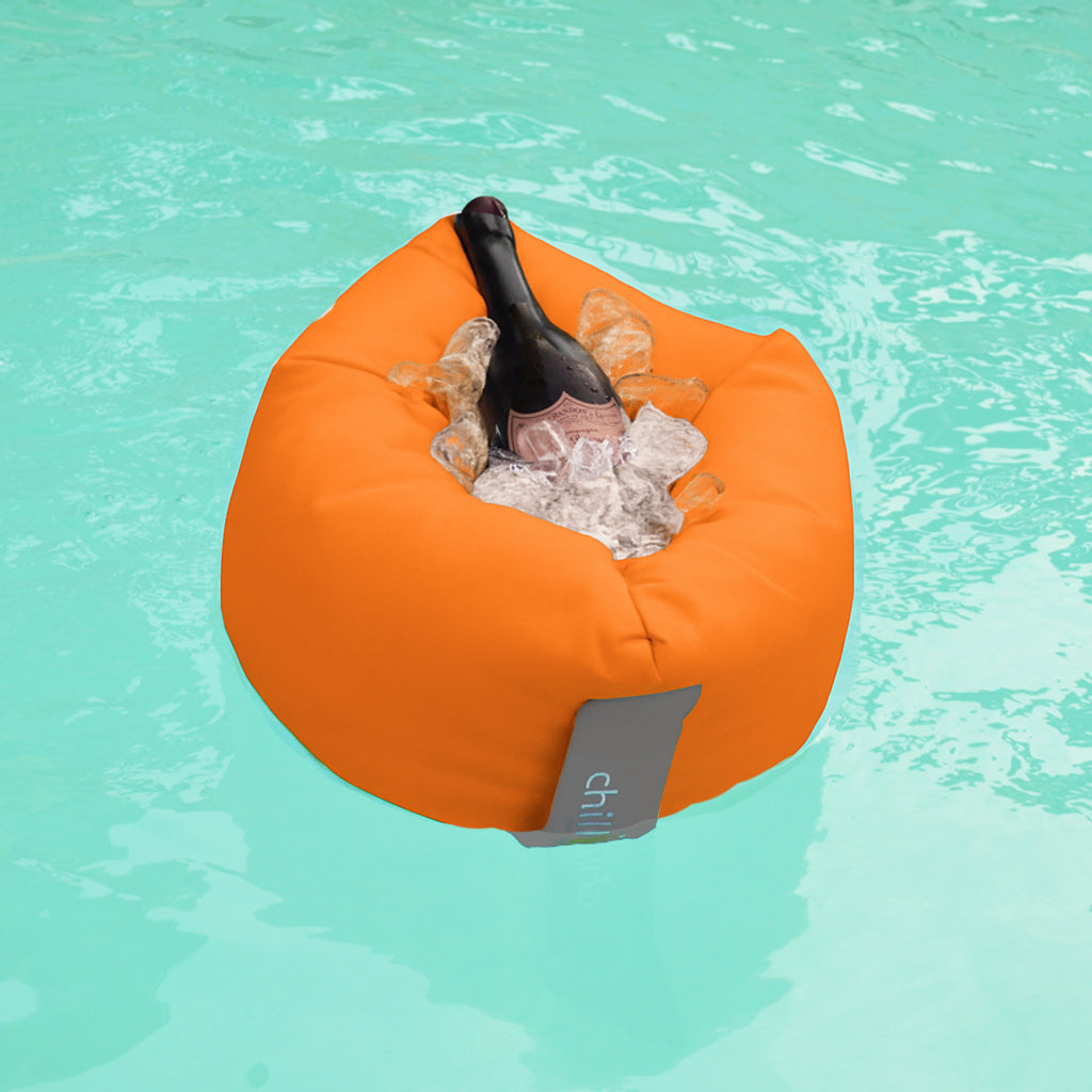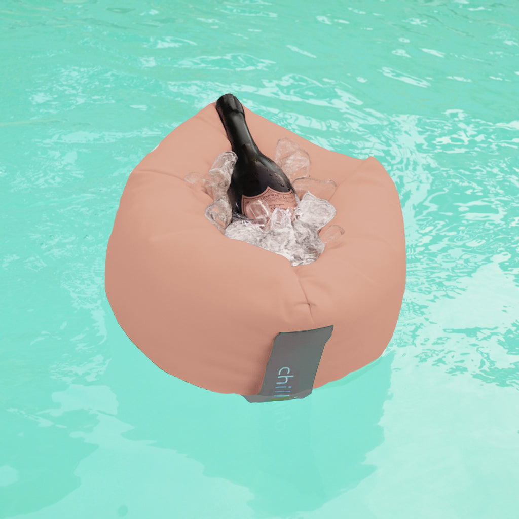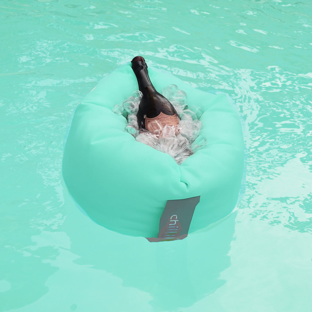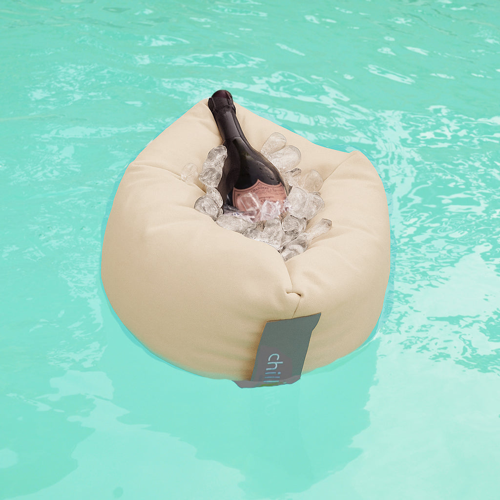 Der Champagner-Kühler ist ein textiles Kissen, mit wasserresistentem Reißverschluss, zusätzlich ausgestattet mit einem integrierten Sicherheitsnetz.