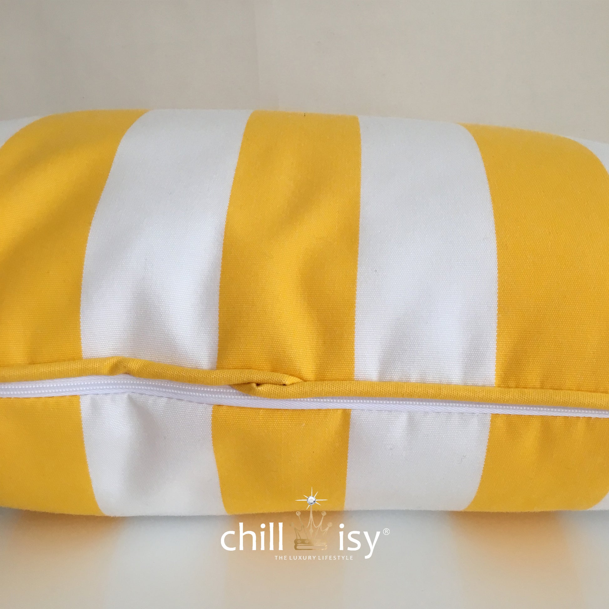 Gelb weiß gestreifte Kissen aus hochwertigem Stoff, der jeder Witterung gewachsen ist. Die maritimen Blockstreifen sind längs ausgerichet. Das Kissen mit einem vierseitigen Keder in Gelb eingefasst. Die Kissenhülle hat einen Reißverschluss, so dass bei Bedarf das Kissen gereinigt werden könnte.