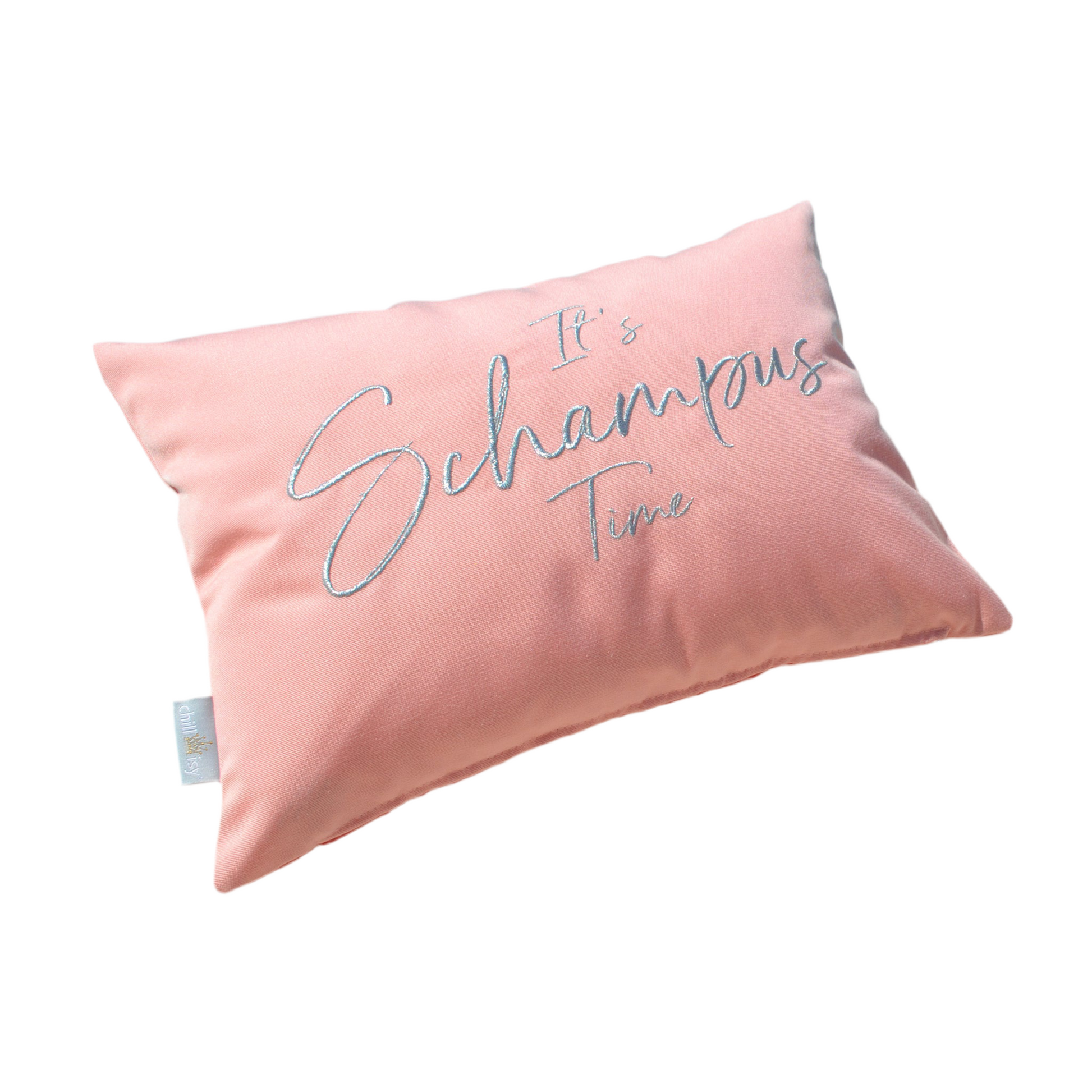 Rosanes Kissen mit silbernem Schriftzug "It's Schampus Time" bestickt. Lieferung inkl. Inlett. Kissengröße 40x30 cm.