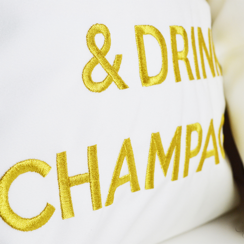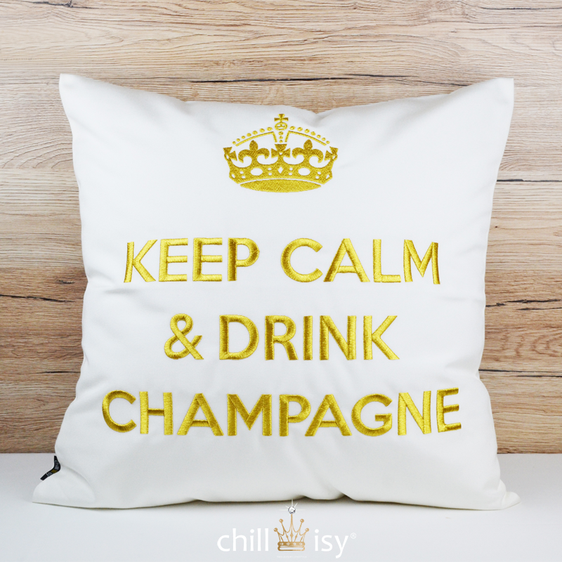 Weißes Kissen mit dem goldenem Schriftzug "Keep Calm & Drink Champagne" bestickt. Lieferung inkl. Inlett. Der Überzug ist mit einem Reißverschluss versehen. Für die Verwendung von Outdoor und Indoor.